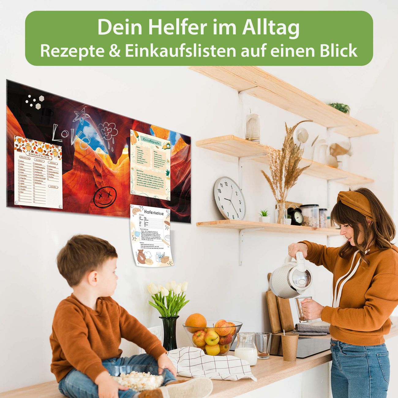 Auf der glatten Glasoberfläche lassen sich Termine, Rezepte oder Notizen ganz einfach mit Kreidestiften festhalten und rückstandslos entfernen. Starke Neodym-Magnete halten Ihre wichtigsten Erinnerungen sicher an Ort und Stelle. So entsteht Ihre ganz persönliche Ideenwand - jeden Tag neu.
