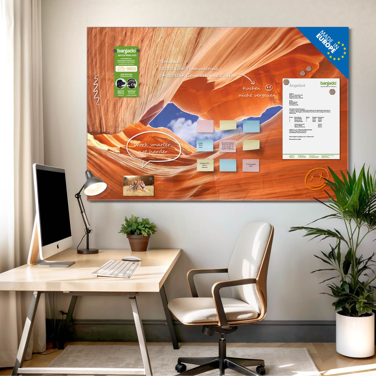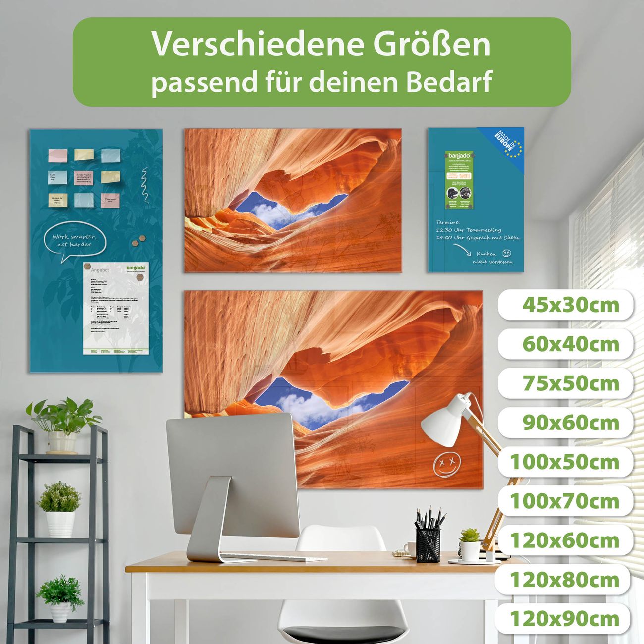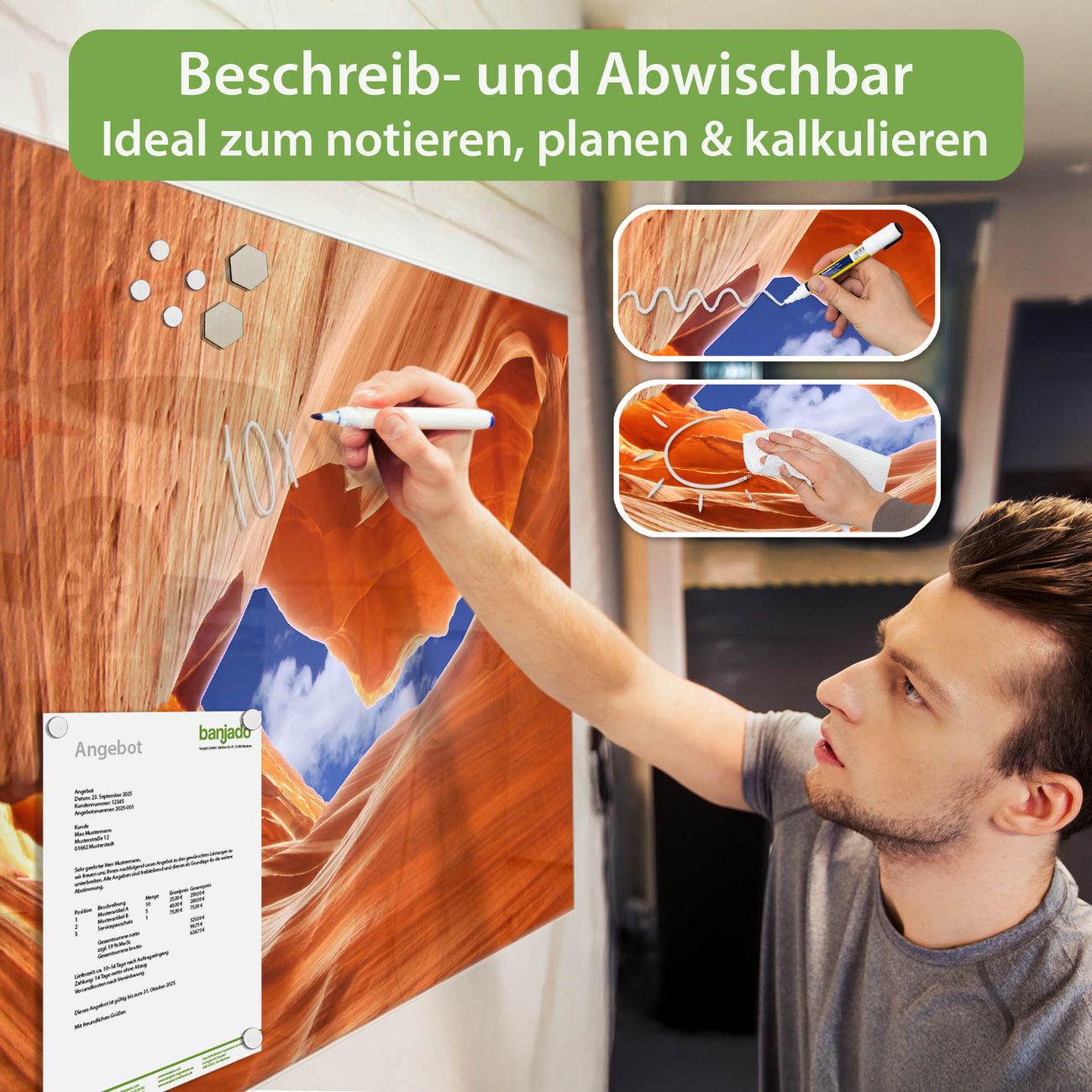 Jede Glas Magnettafel wird in unserer Werkstatt von Hand gefertigt und sorgfältig geprüft. So erhalten Sie ein echtes Qualitätsprodukt, das Funktion und Ästhetik perfekt vereint.?? Warum banjado?