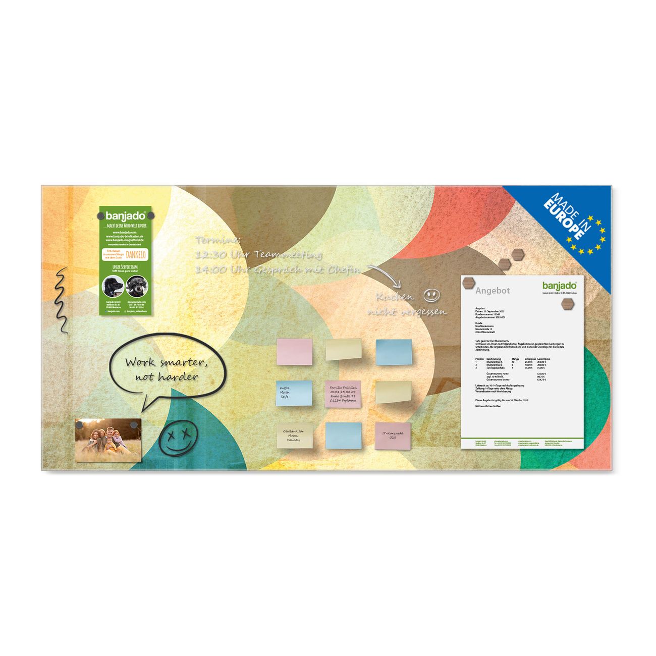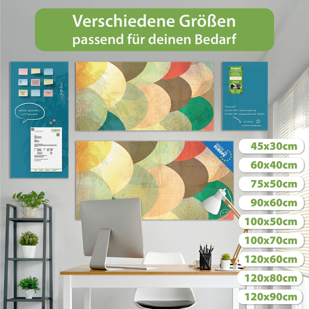 Jede Glas Magnettafel wird in unserer Werkstatt von Hand gefertigt und sorgfältig geprüft. So erhalten Sie ein echtes Qualitätsprodukt, das Funktion und Ästhetik perfekt vereint.?? Warum banjado?