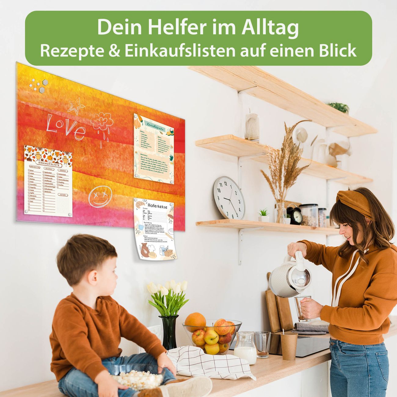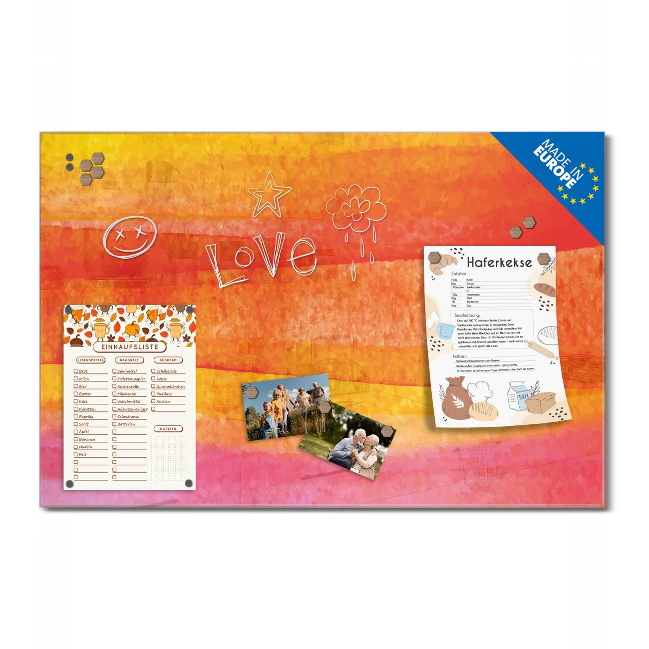 Auf der glatten Glasoberfläche lassen sich Termine, Rezepte oder Notizen ganz einfach mit Kreidestiften festhalten und rückstandslos entfernen. Starke Neodym-Magnete halten Ihre wichtigsten Erinnerungen sicher an Ort und Stelle. So entsteht Ihre ganz persönliche Ideenwand - jeden Tag neu.