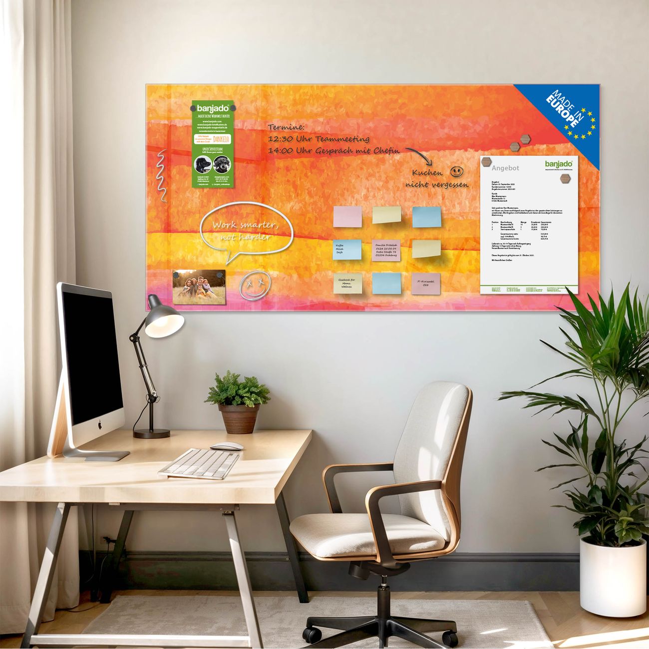 Jede Glas Magnettafel wird in unserer Werkstatt von Hand gefertigt und sorgfältig geprüft. So erhalten Sie ein echtes Qualitätsprodukt, das Funktion und Ästhetik perfekt vereint.?? Warum banjado?