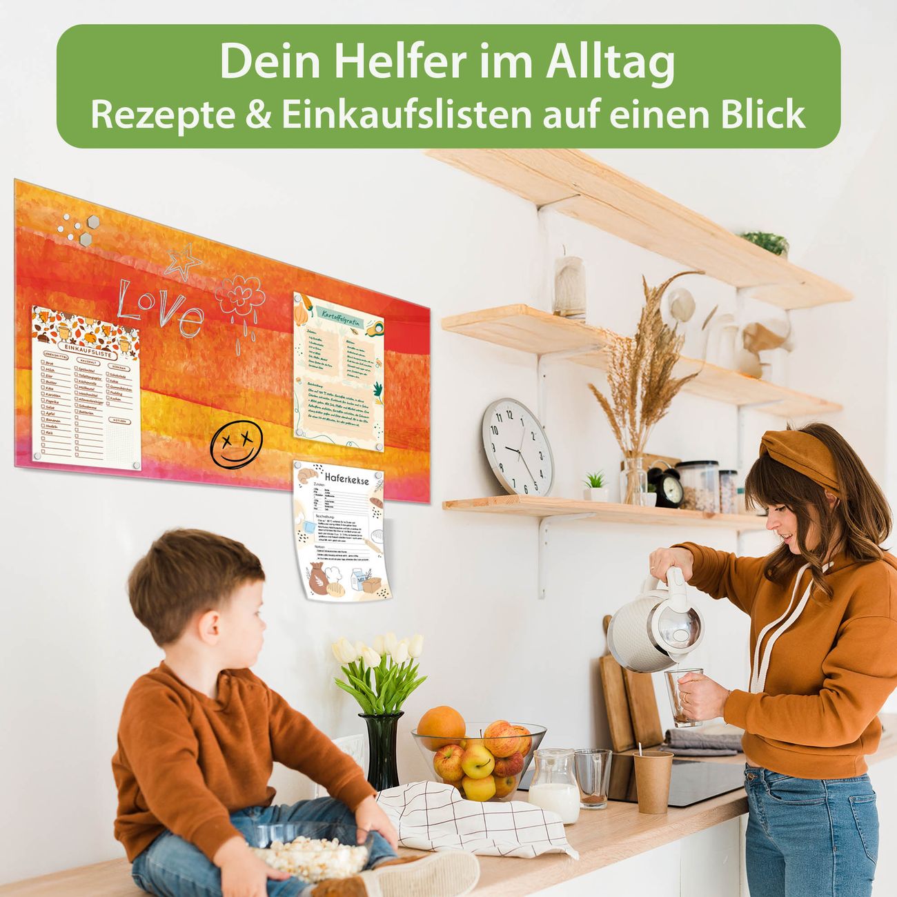 Auf der glatten Glasoberfläche lassen sich Termine, Rezepte oder Notizen ganz einfach mit Kreidestiften festhalten und rückstandslos entfernen. Starke Neodym-Magnete halten Ihre wichtigsten Erinnerungen sicher an Ort und Stelle. So entsteht Ihre ganz persönliche Ideenwand - jeden Tag neu.