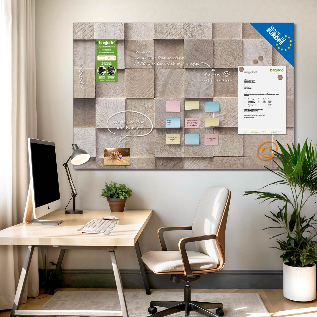 Die banjado Glas Magnettafel mit dem Motiv Motiv Bauklötze Relief verbindet Funktionalität mit Stil. Sie ersetzt das Zettelchaos durch klare Strukturen und bringt dabei eine warme, natürliche Atmosphäre in Ihr Zuhause. Ob im Büro, in der Küche oder im Eingangsbereich - dieses Design-Board zieht Blicke an und sorgt für Ordnung mit Charakter.