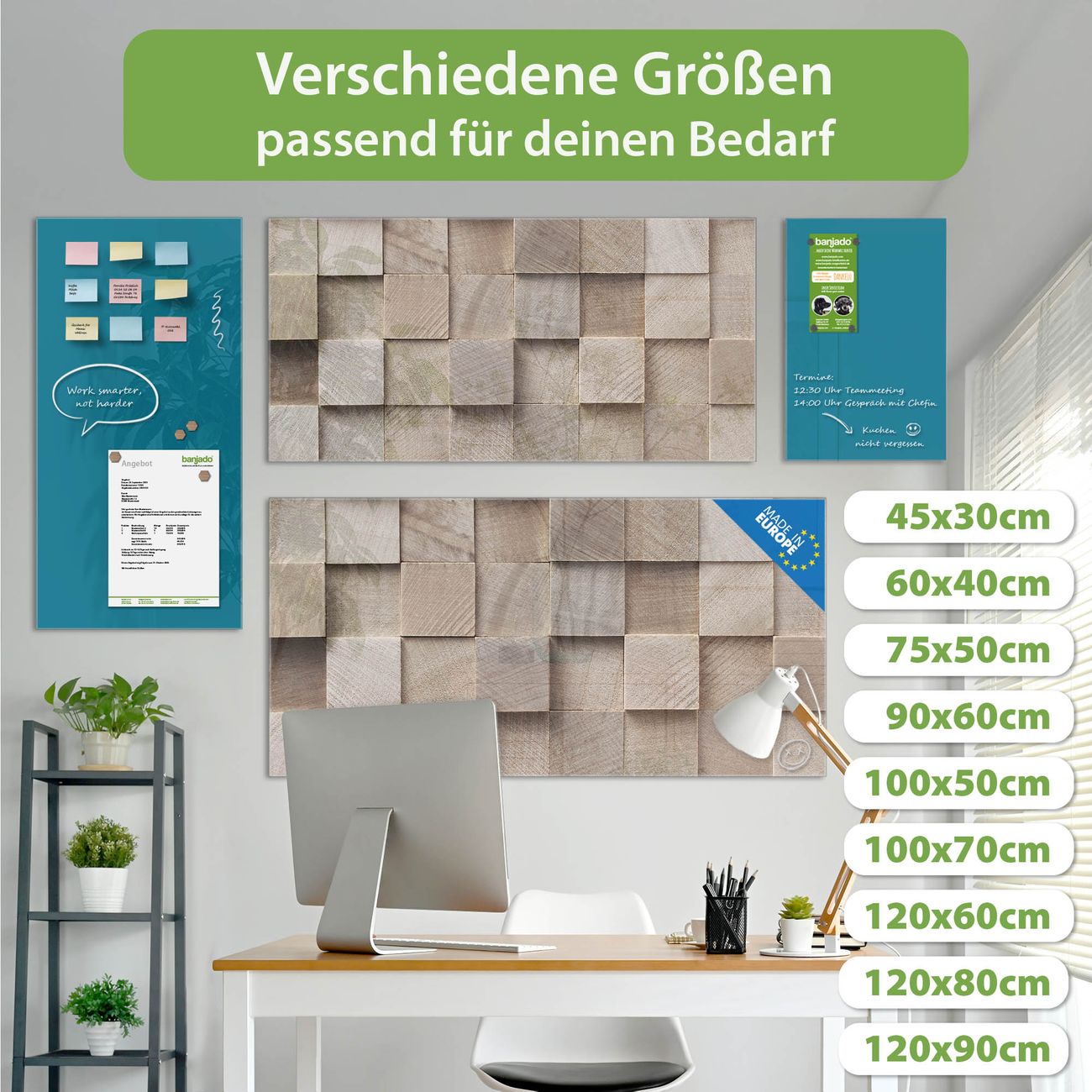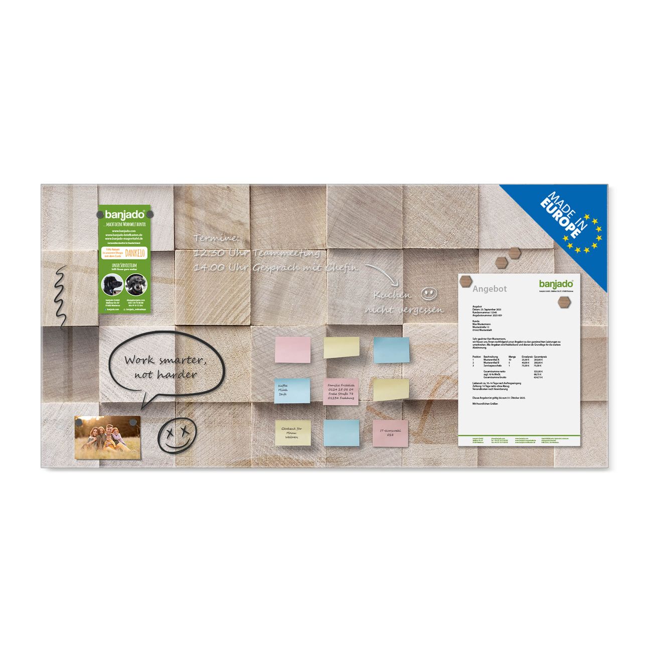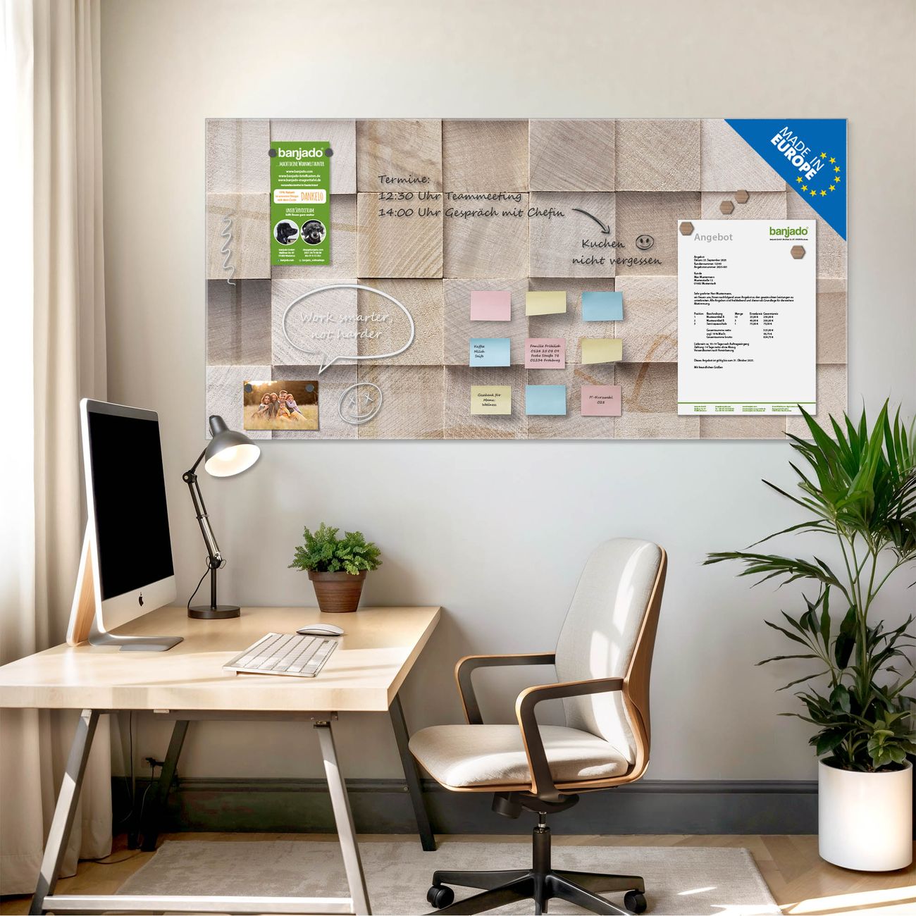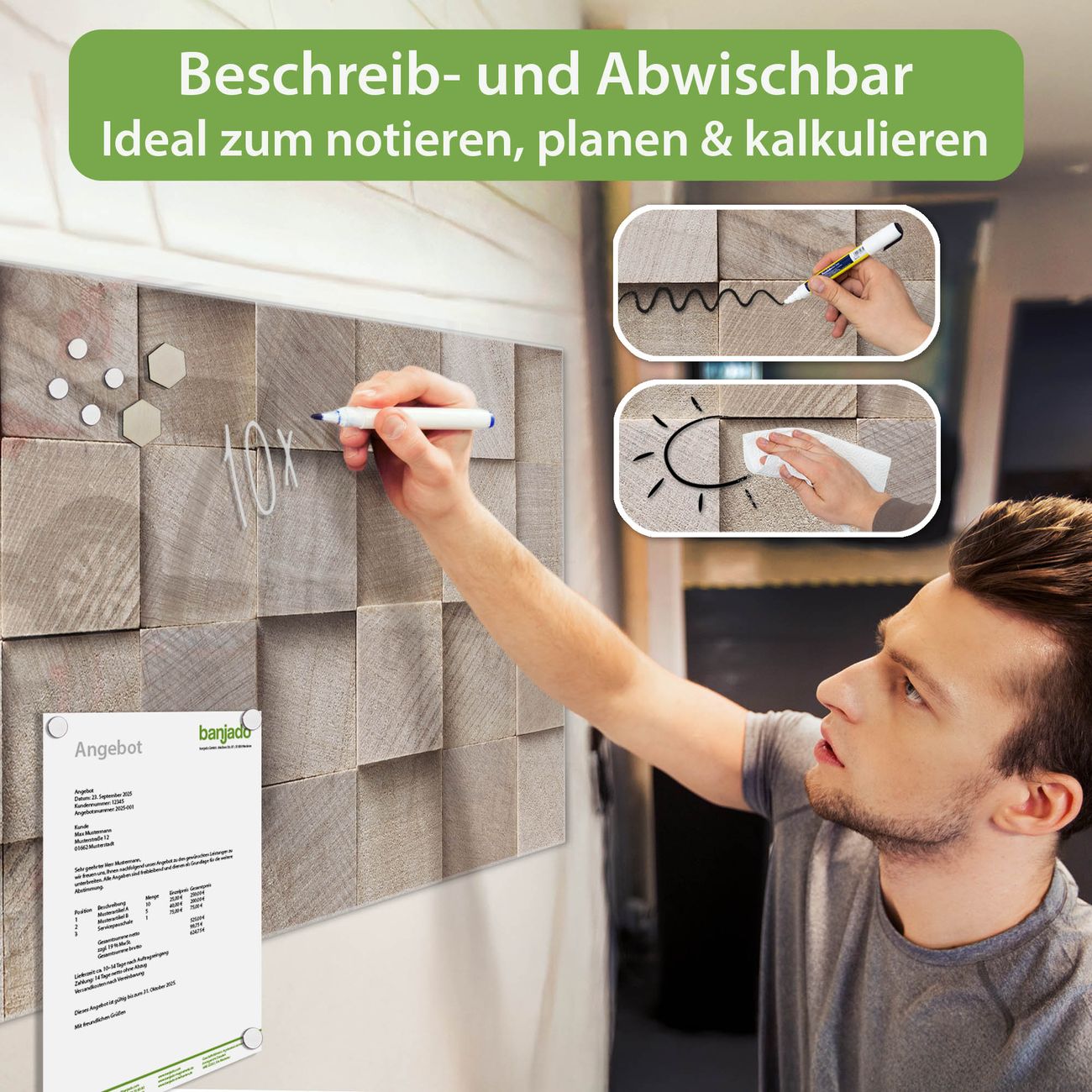Jede Glas Magnettafel wird in unserer Werkstatt von Hand gefertigt und sorgfältig geprüft. So erhalten Sie ein echtes Qualitätsprodukt, das Funktion und Ästhetik perfekt vereint.?? Warum banjado?