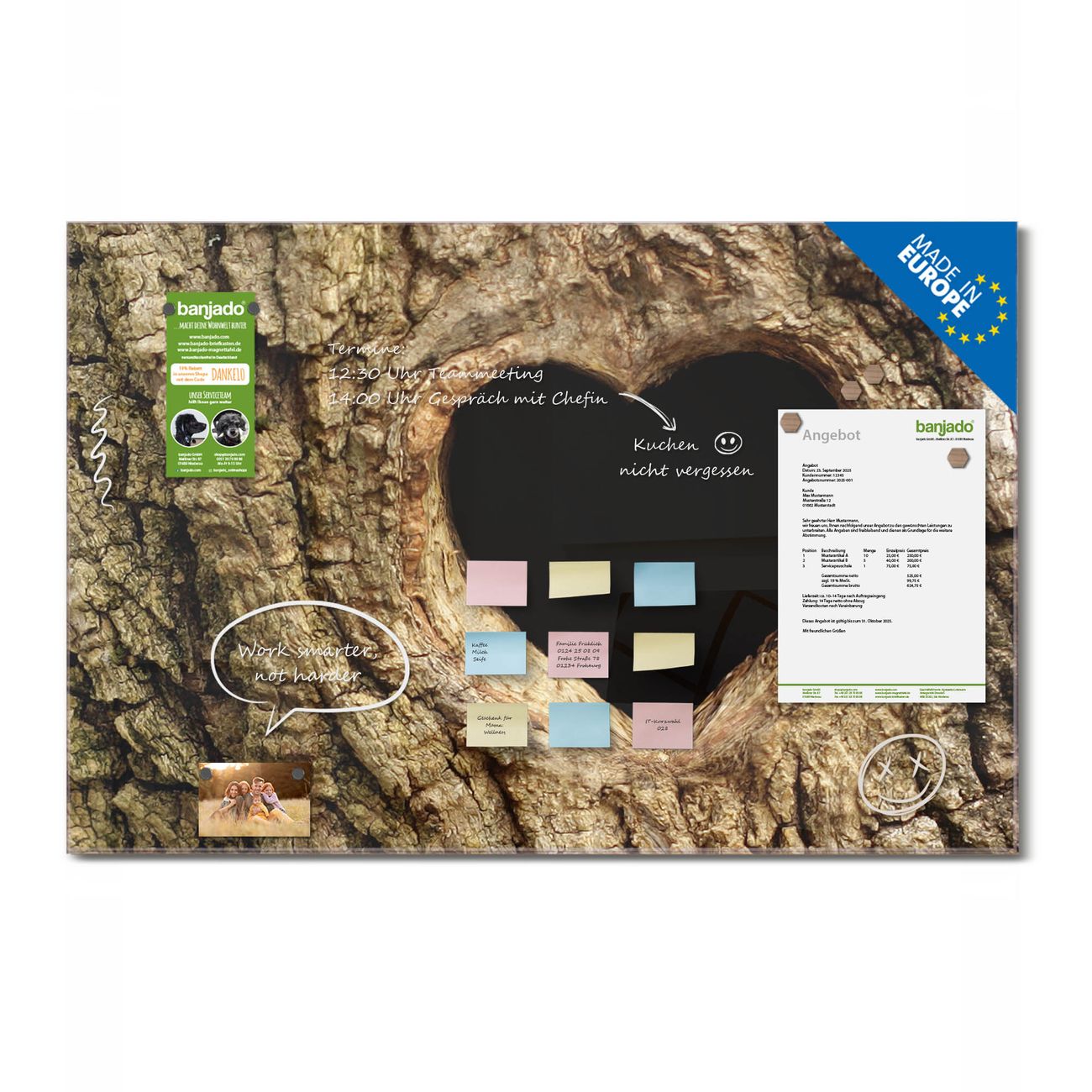 Jede Glas Magnettafel wird in unserer Werkstatt von Hand gefertigt und sorgfältig geprüft. So erhalten Sie ein echtes Qualitätsprodukt, das Funktion und Ästhetik perfekt vereint.?? Warum banjado?