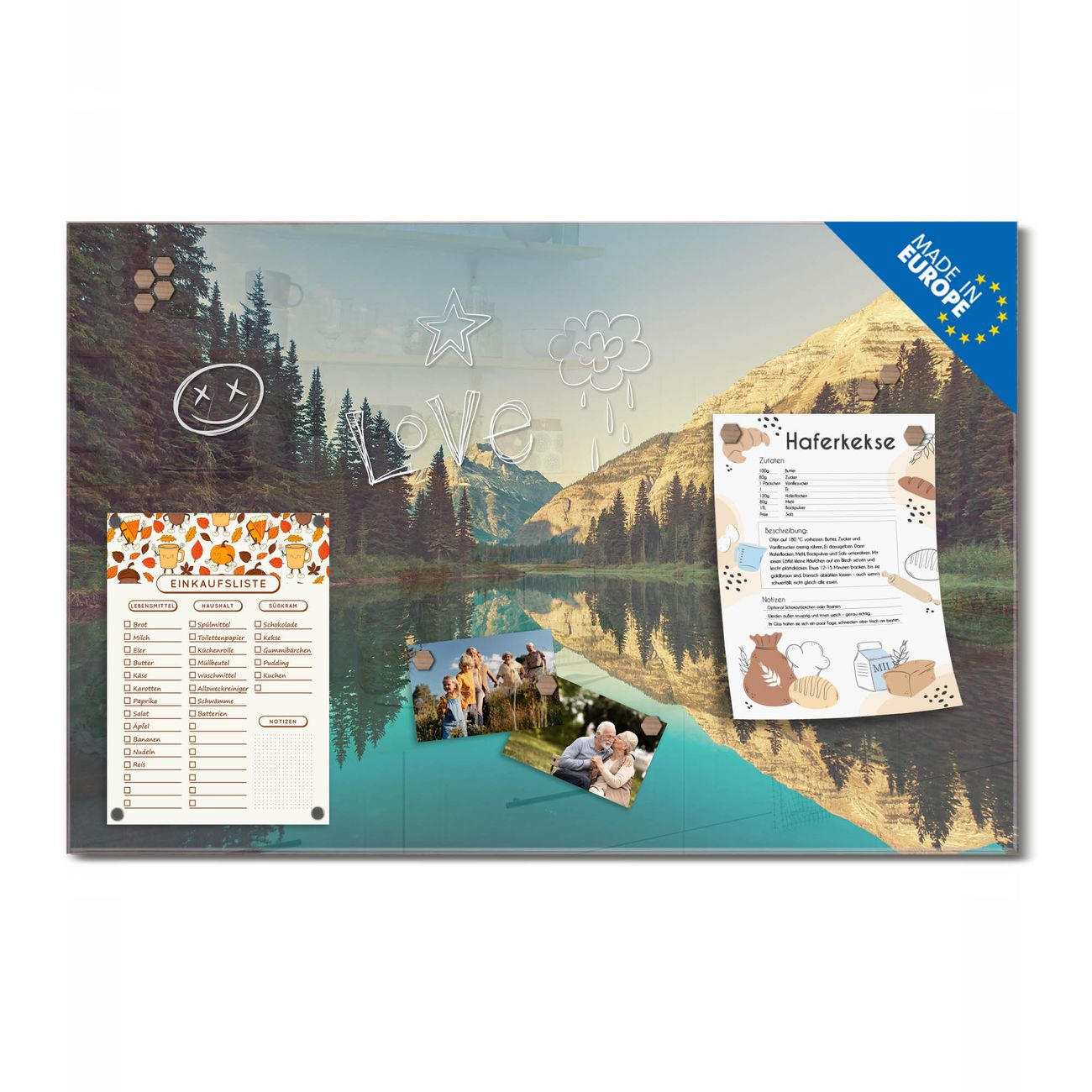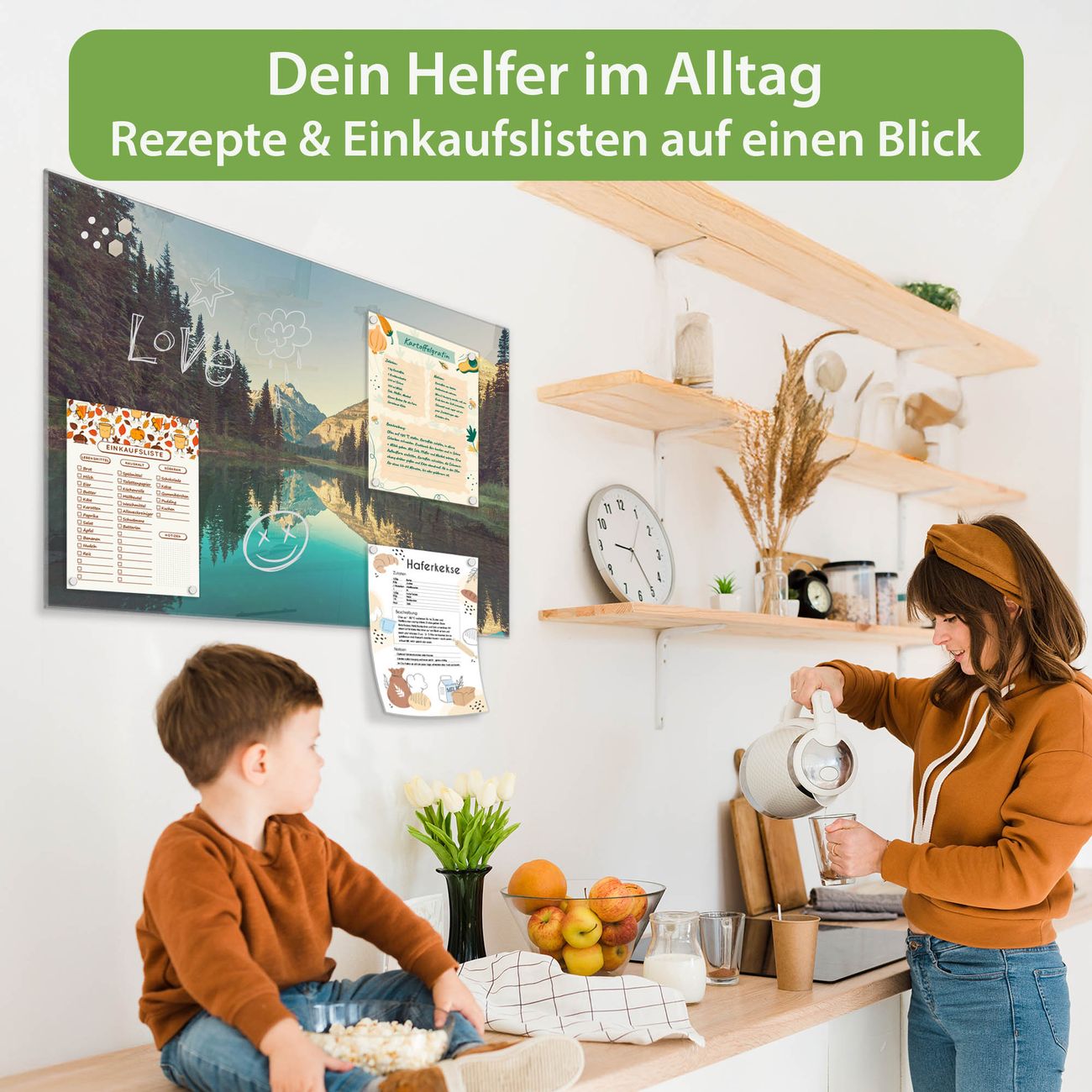 Ein Stück Design, das Ihren Alltag organisiert. Schreiben, heften, inspirieren - alles an einem Ort. Qualität, die man spürt. Montage leicht gemacht. Handwerk mit Herz - veredelt in Sachsen. Einzigartiges Design mit Motiv Motiv Bergsee Beschreibbare Glasoberfläche, leicht zu reinigen Starke Magnetkraft durch Stahlrückwand Inklusive 4 Neodym-Magneten Flexible Montageoptionen Handveredelt in Sachsen - Qualität, die bleibt