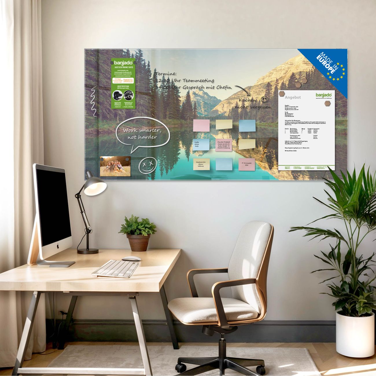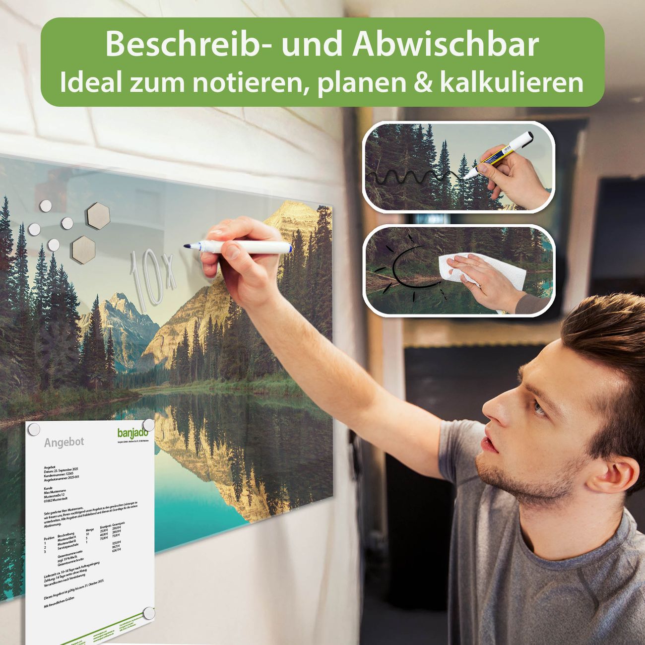 Jede Glas Magnettafel wird in unserer Werkstatt von Hand gefertigt und sorgfältig geprüft. So erhalten Sie ein echtes Qualitätsprodukt, das Funktion und Ästhetik perfekt vereint.?? Warum banjado?