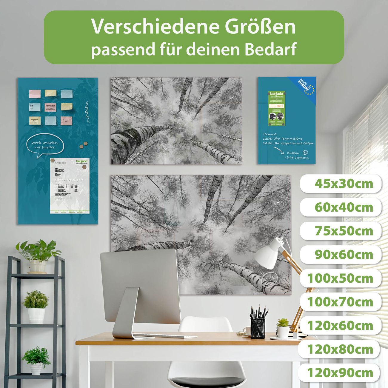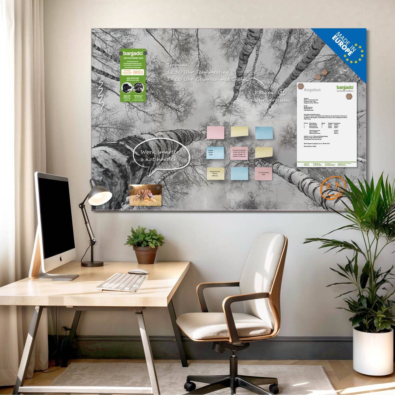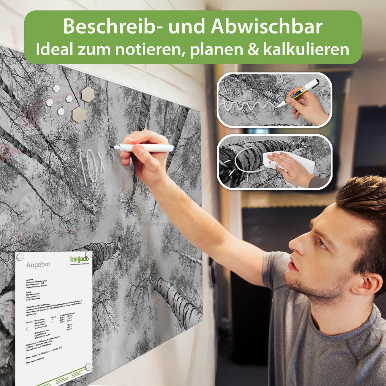 Jede Glas Magnettafel wird in unserer Werkstatt von Hand gefertigt und sorgfältig geprüft. So erhalten Sie ein echtes Qualitätsprodukt, das Funktion und Ästhetik perfekt vereint.?? Warum banjado?