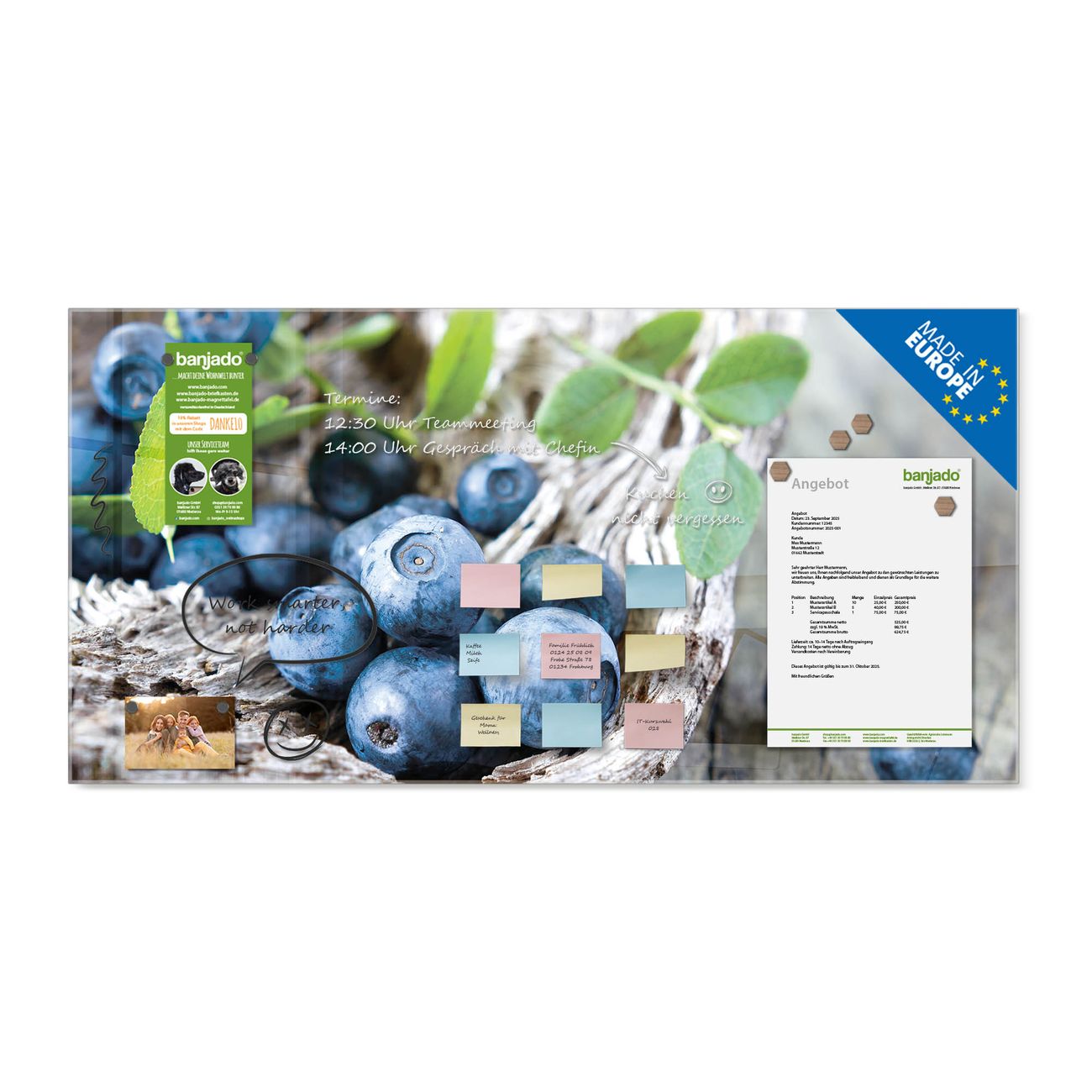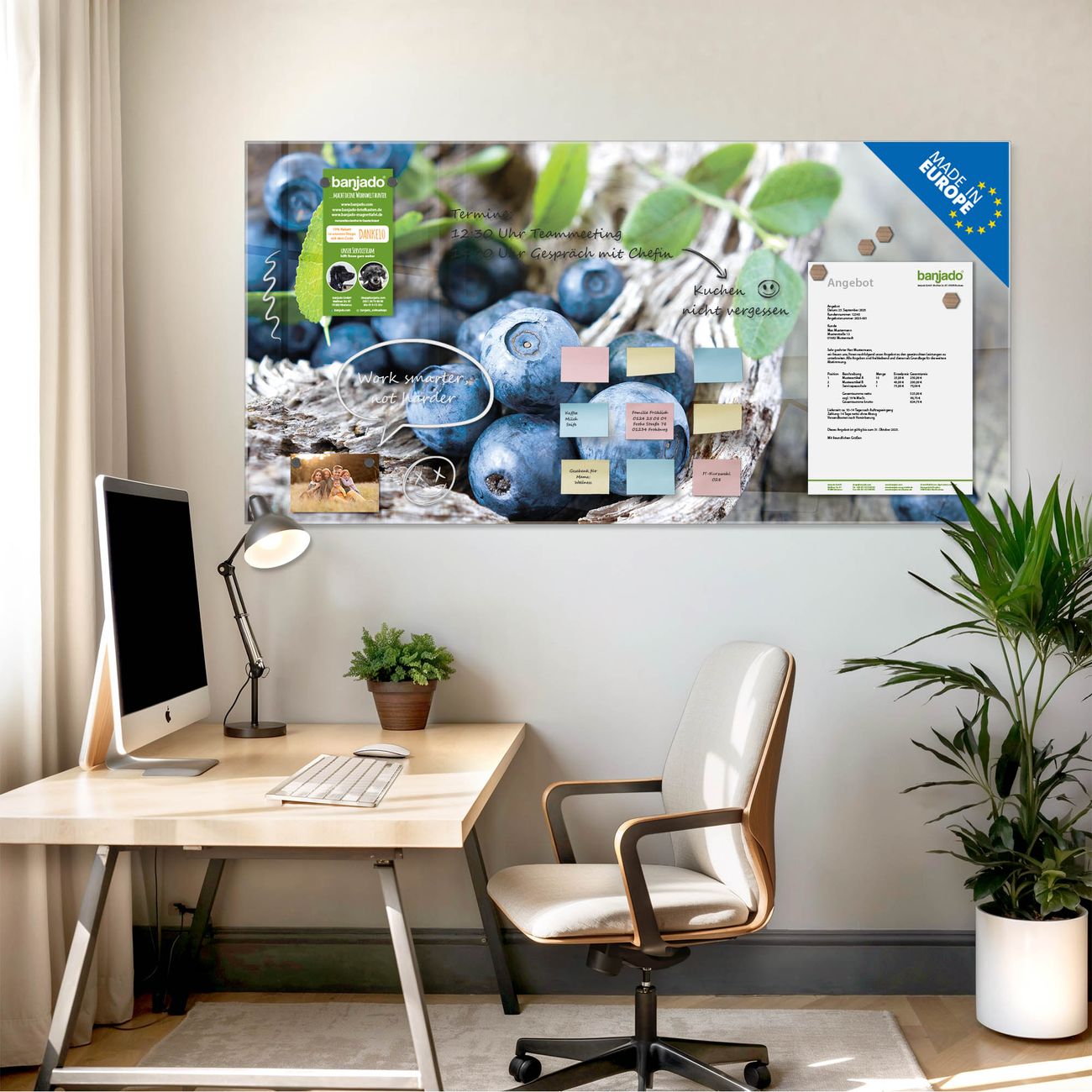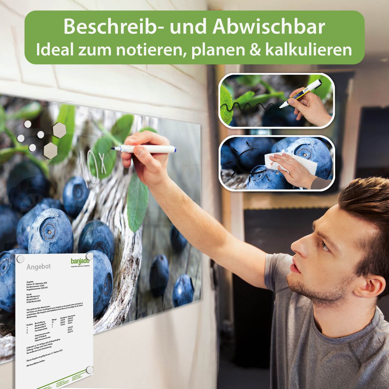Jede Glas Magnettafel wird in unserer Werkstatt von Hand gefertigt und sorgfältig geprüft. So erhalten Sie ein echtes Qualitätsprodukt, das Funktion und Ästhetik perfekt vereint.?? Warum banjado?