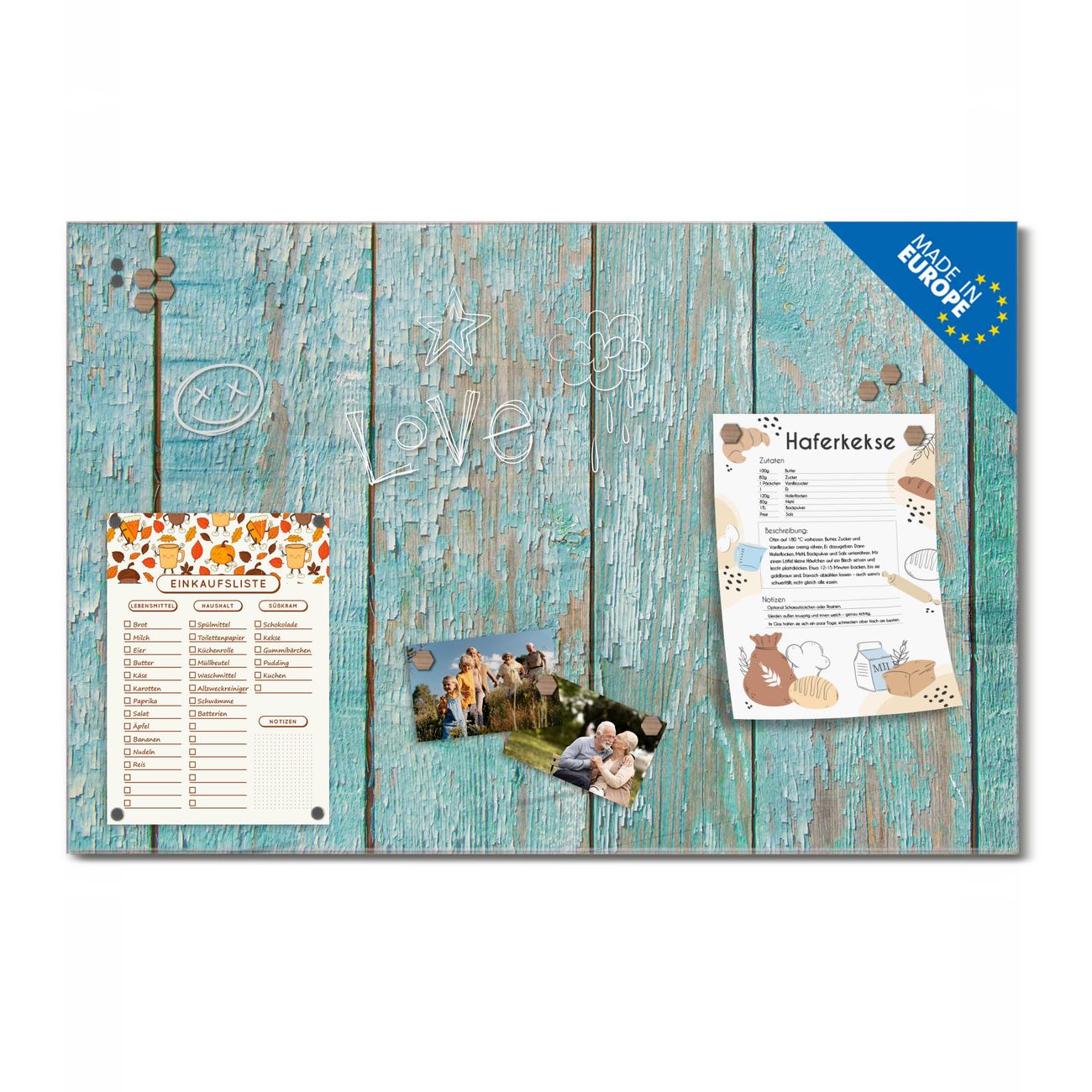 Ein Stück Design, das Ihren Alltag organisiert. Schreiben, heften, inspirieren - alles an einem Ort. Qualität, die man spürt. Montage leicht gemacht. Handwerk mit Herz - veredelt in Sachsen. Einzigartiges Design mit Motiv Motiv Blaue Planken Beschreibbare Glasoberfläche, leicht zu reinigen Starke Magnetkraft durch Stahlrückwand Inklusive 4 Neodym-Magneten Flexible Montageoptionen Handveredelt in Sachsen - Qualität, die bleibt