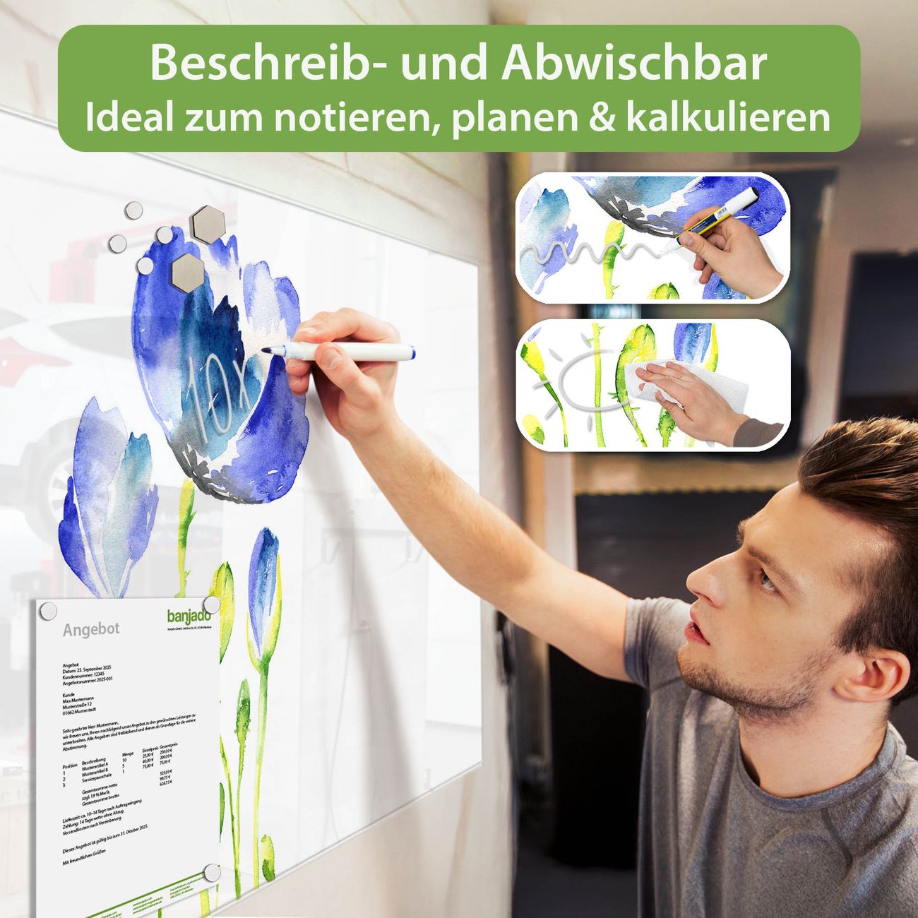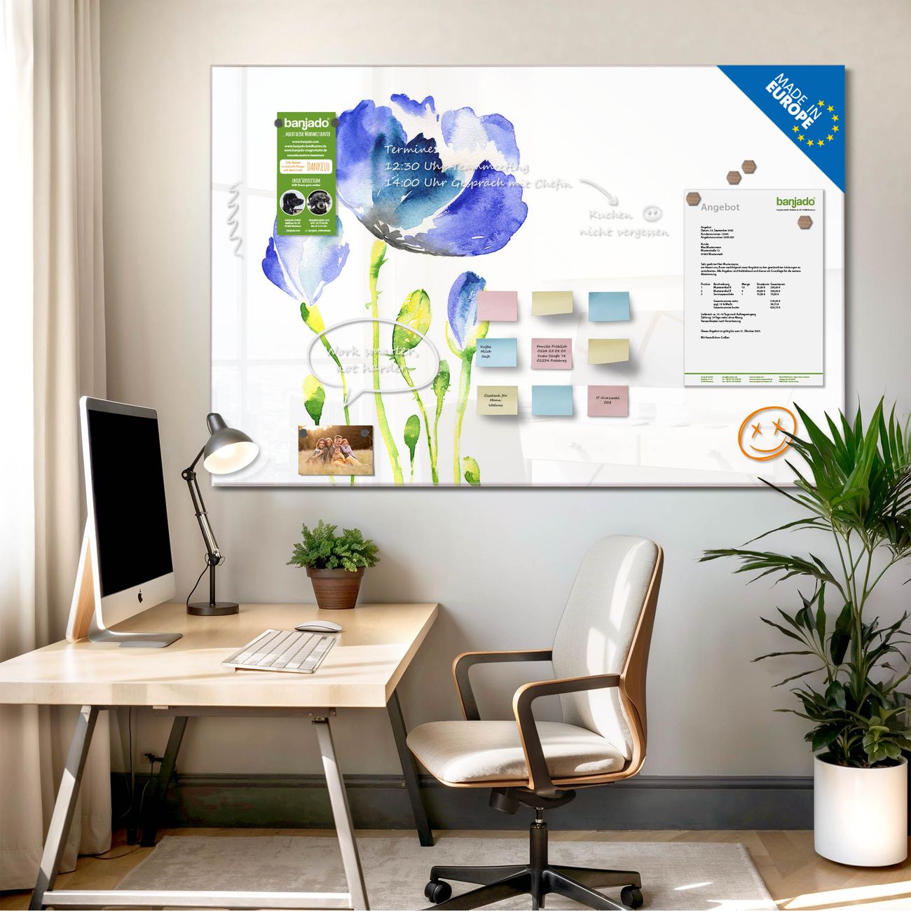 Jede Glas Magnettafel wird in unserer Werkstatt von Hand gefertigt und sorgfältig geprüft. So erhalten Sie ein echtes Qualitätsprodukt, das Funktion und Ästhetik perfekt vereint.?? Warum banjado?