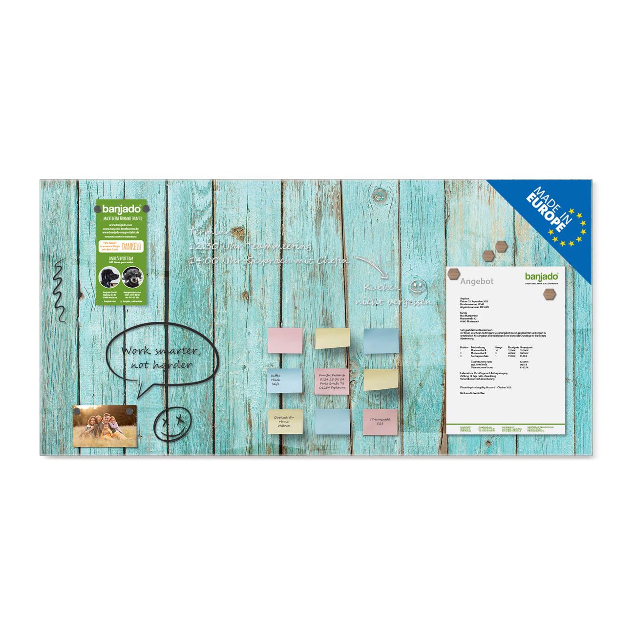 Jede Glas Magnettafel wird in unserer Werkstatt von Hand gefertigt und sorgfältig geprüft. So erhalten Sie ein echtes Qualitätsprodukt, das Funktion und Ästhetik perfekt vereint.?? Warum banjado?