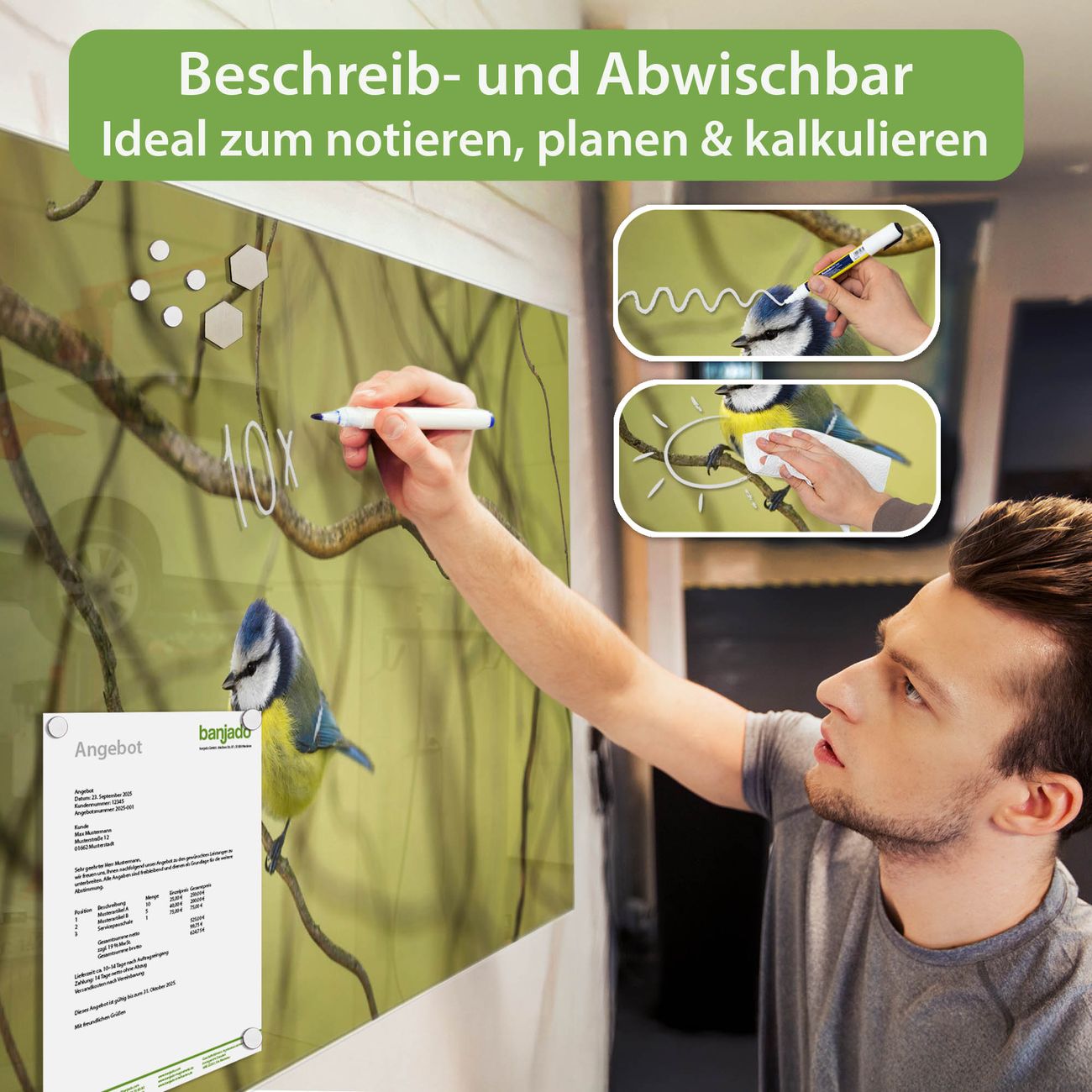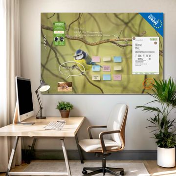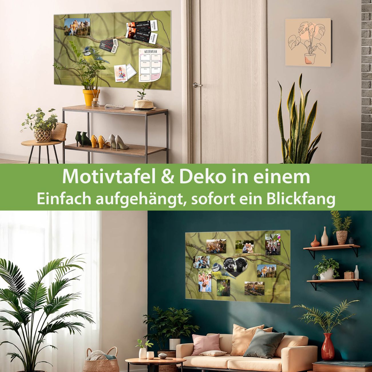 Die banjado Glas Magnettafel mit dem Motiv Motiv Blaumeise im Baum verbindet Funktionalität mit Stil. Sie ersetzt das Zettelchaos durch klare Strukturen und bringt dabei eine warme, natürliche Atmosphäre in Ihr Zuhause. Ob im Büro, in der Küche oder im Eingangsbereich - dieses Design-Board zieht Blicke an und sorgt für Ordnung mit Charakter.
