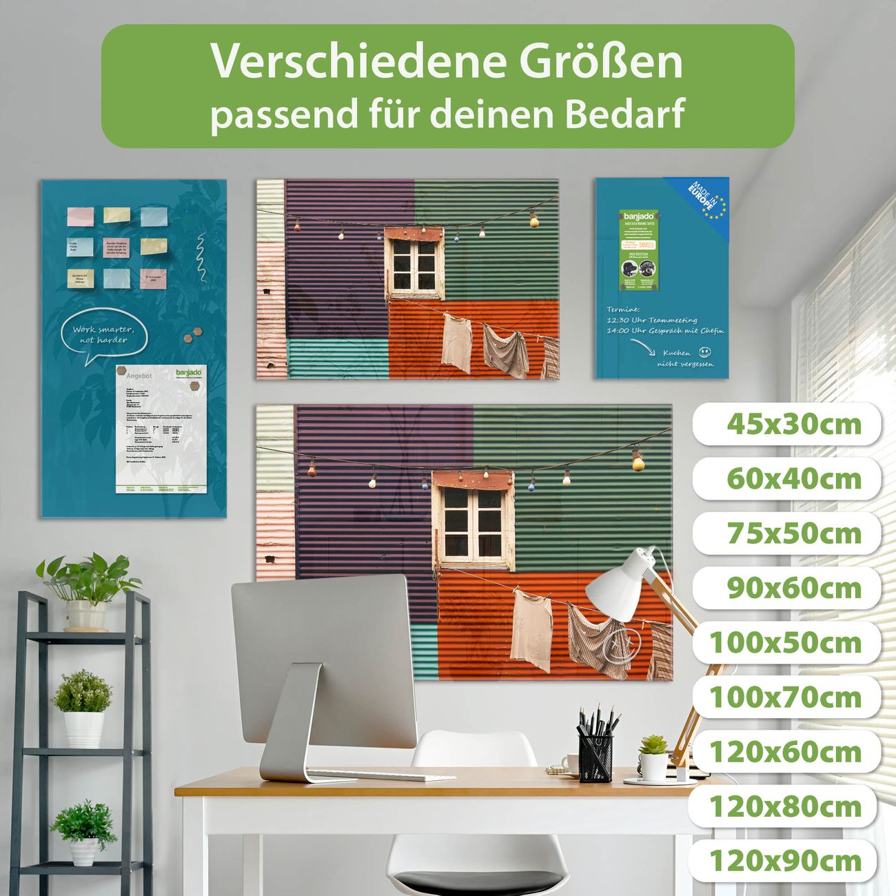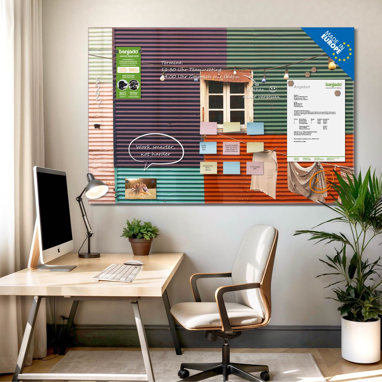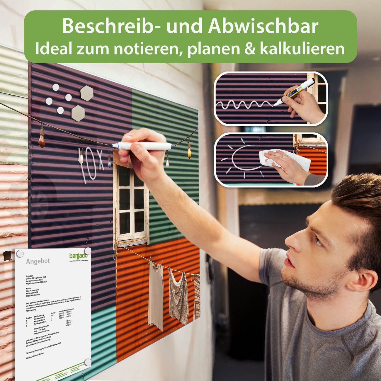 Jede Glas Magnettafel wird in unserer Werkstatt von Hand gefertigt und sorgfältig geprüft. So erhalten Sie ein echtes Qualitätsprodukt, das Funktion und Ästhetik perfekt vereint.?? Warum banjado?