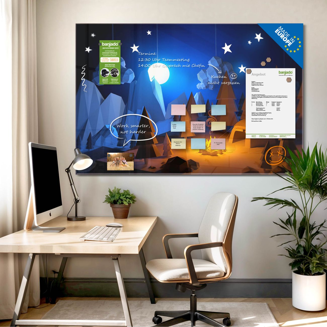 Die banjado Glas Magnettafel mit dem Motiv Motiv Camping 2 verbindet Funktionalität mit Stil. Sie ersetzt das Zettelchaos durch klare Strukturen und bringt dabei eine warme, natürliche Atmosphäre in Ihr Zuhause. Ob im Büro, in der Küche oder im Eingangsbereich - dieses Design-Board zieht Blicke an und sorgt für Ordnung mit Charakter.