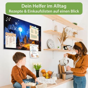 Auf der glatten Glasoberfläche lassen sich Termine, Rezepte oder Notizen ganz einfach mit Kreidestiften festhalten und rückstandslos entfernen. Starke Neodym-Magnete halten Ihre wichtigsten Erinnerungen sicher an Ort und Stelle. So entsteht Ihre ganz persönliche Ideenwand - jeden Tag neu.