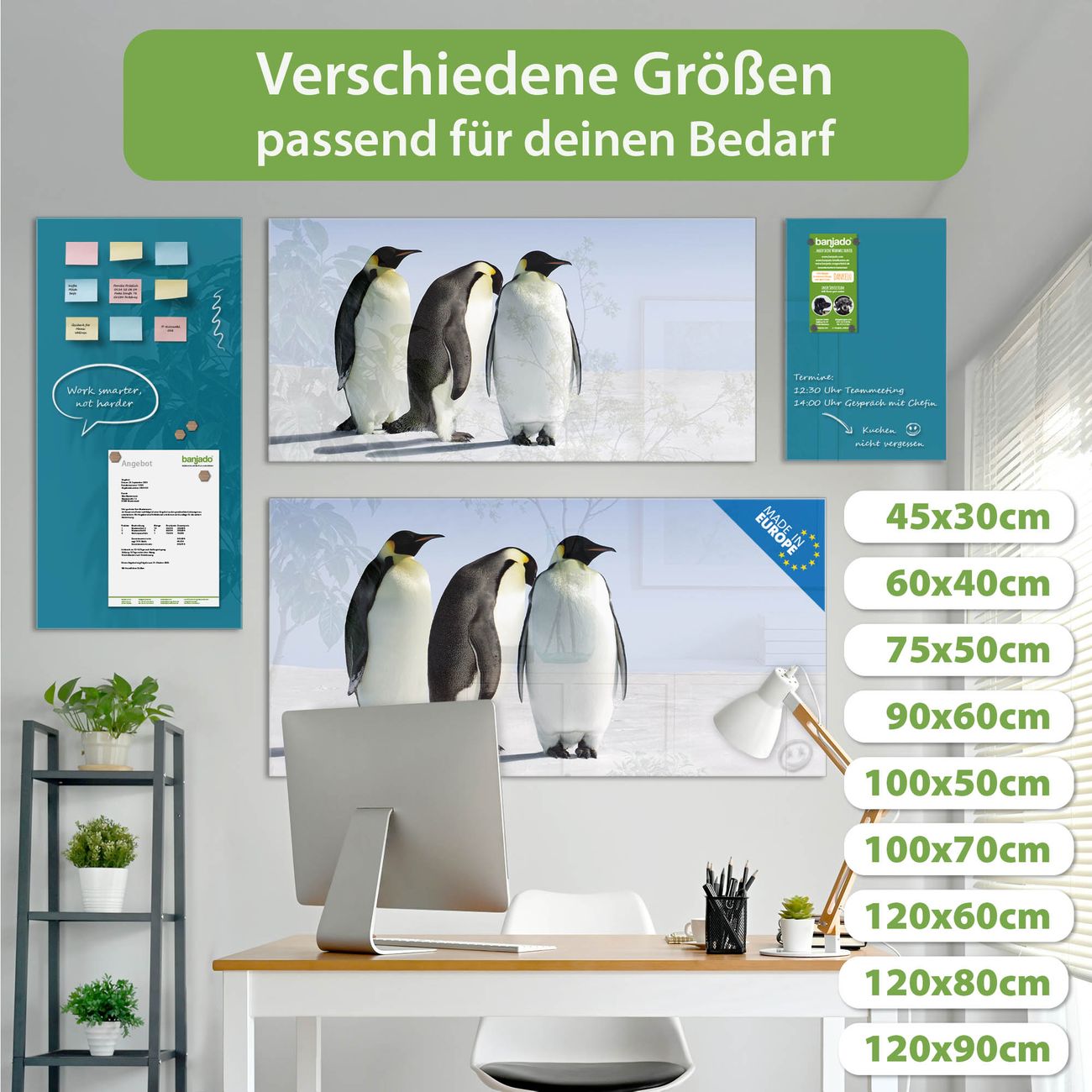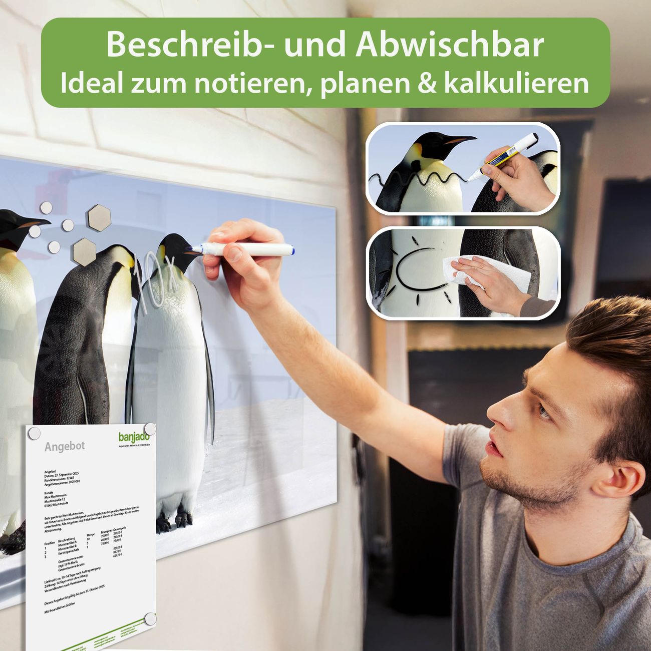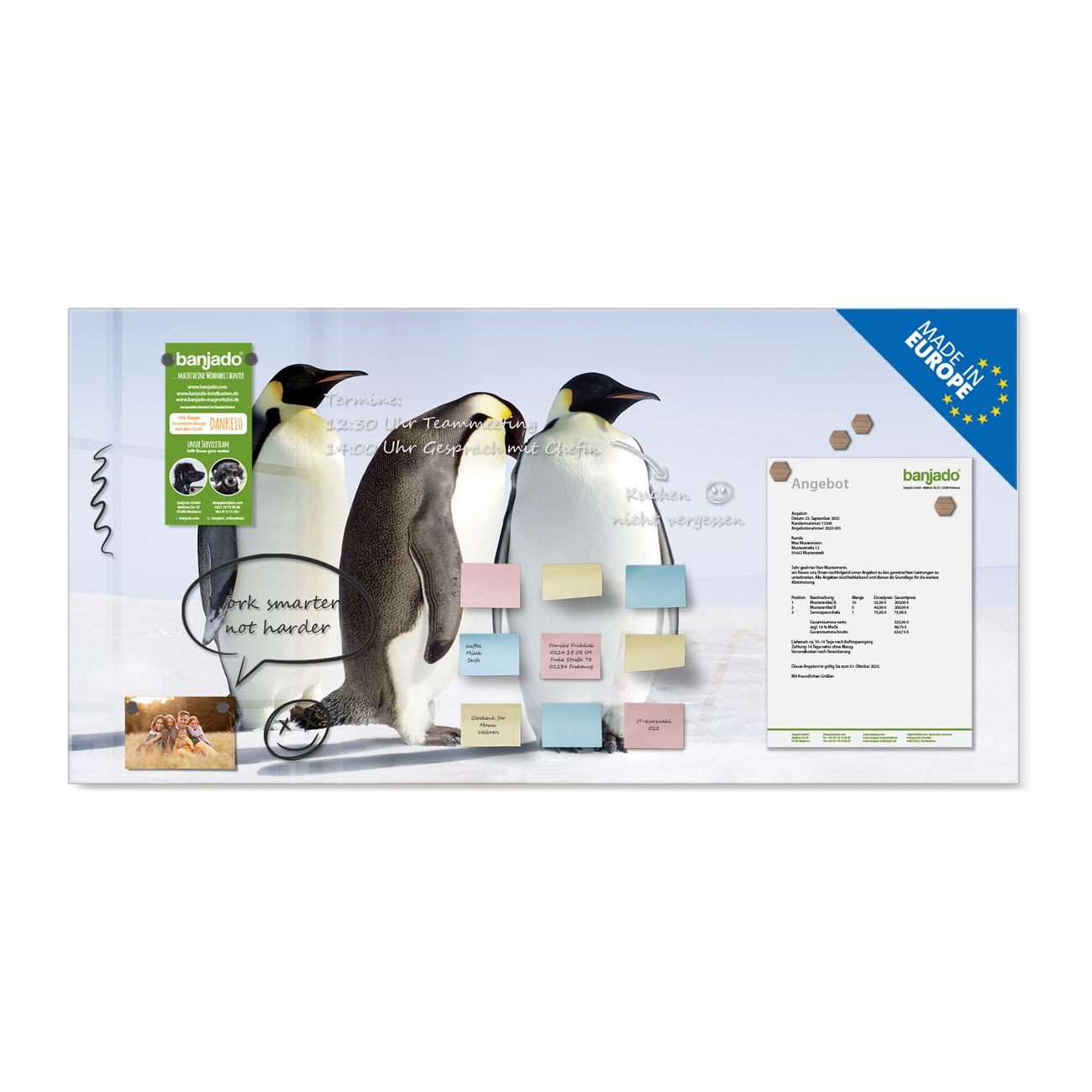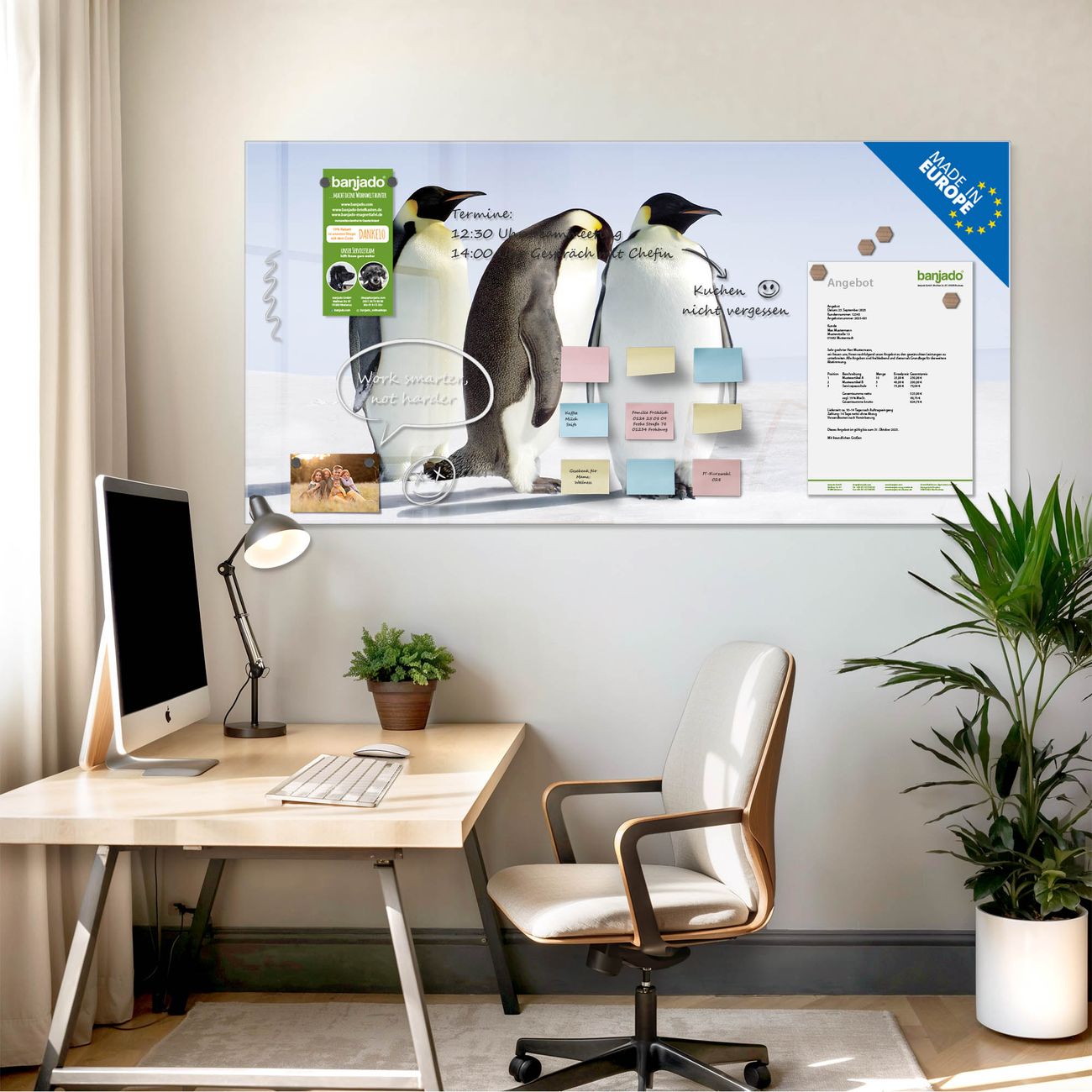 Jede Glas Magnettafel wird in unserer Werkstatt von Hand gefertigt und sorgfältig geprüft. So erhalten Sie ein echtes Qualitätsprodukt, das Funktion und Ästhetik perfekt vereint.?? Warum banjado?