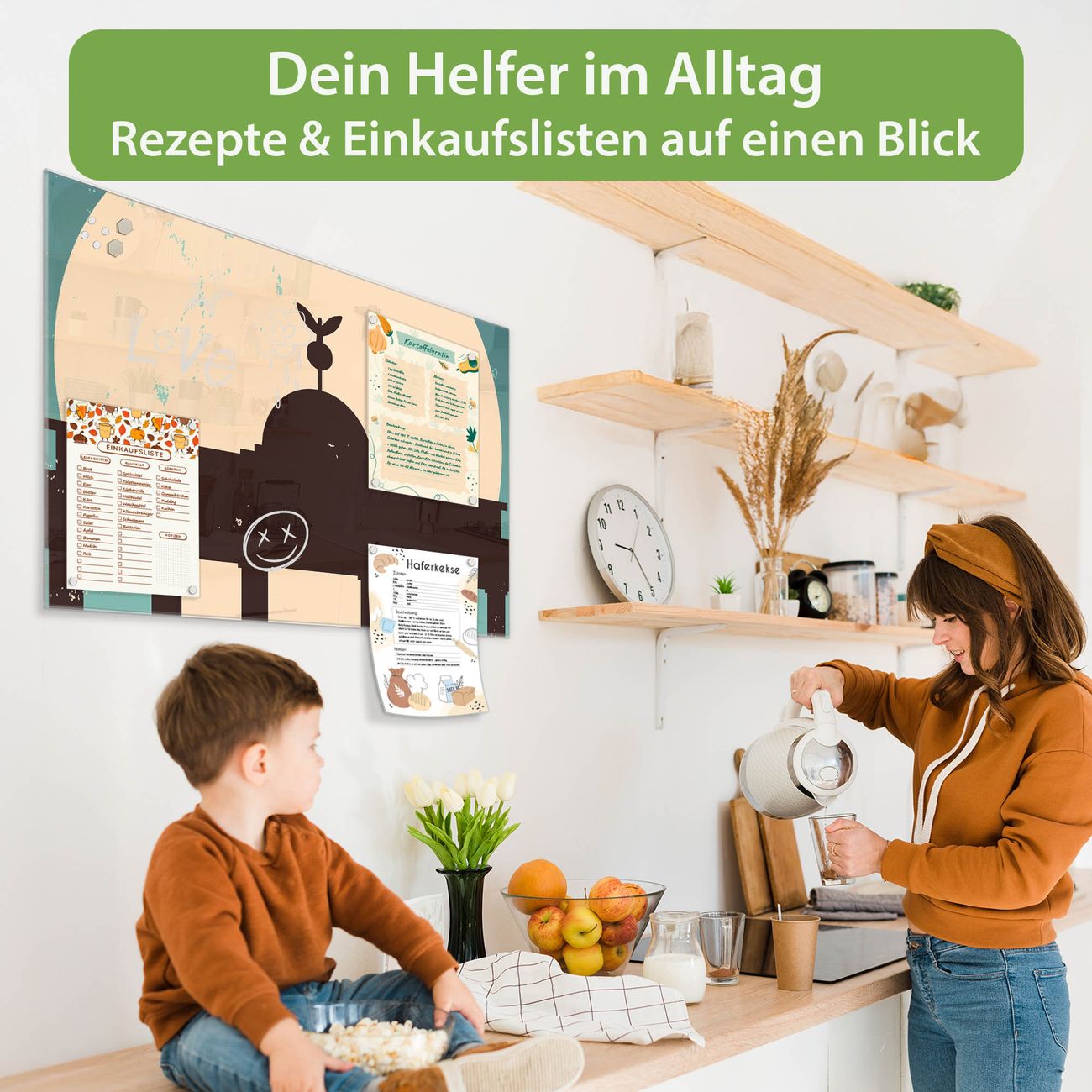 Auf der glatten Glasoberfläche lassen sich Termine, Rezepte oder Notizen ganz einfach mit Kreidestiften festhalten und rückstandslos entfernen. Starke Neodym-Magnete halten Ihre wichtigsten Erinnerungen sicher an Ort und Stelle. So entsteht Ihre ganz persönliche Ideenwand - jeden Tag neu.