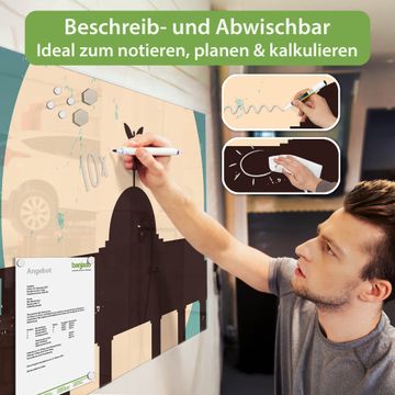 Ein Stück Design, das Ihren Alltag organisiert. Schreiben, heften, inspirieren - alles an einem Ort. Qualität, die man spürt. Montage leicht gemacht. Handwerk mit Herz - veredelt in Sachsen. Einzigartiges Design mit Motiv Motiv City Poster Berlin Beschreibbare Glasoberfläche, leicht zu reinigen Starke Magnetkraft durch Stahlrückwand Inklusive 4 Neodym-Magneten Flexible Montageoptionen Handveredelt in Sachsen - Qualität, die bleibt