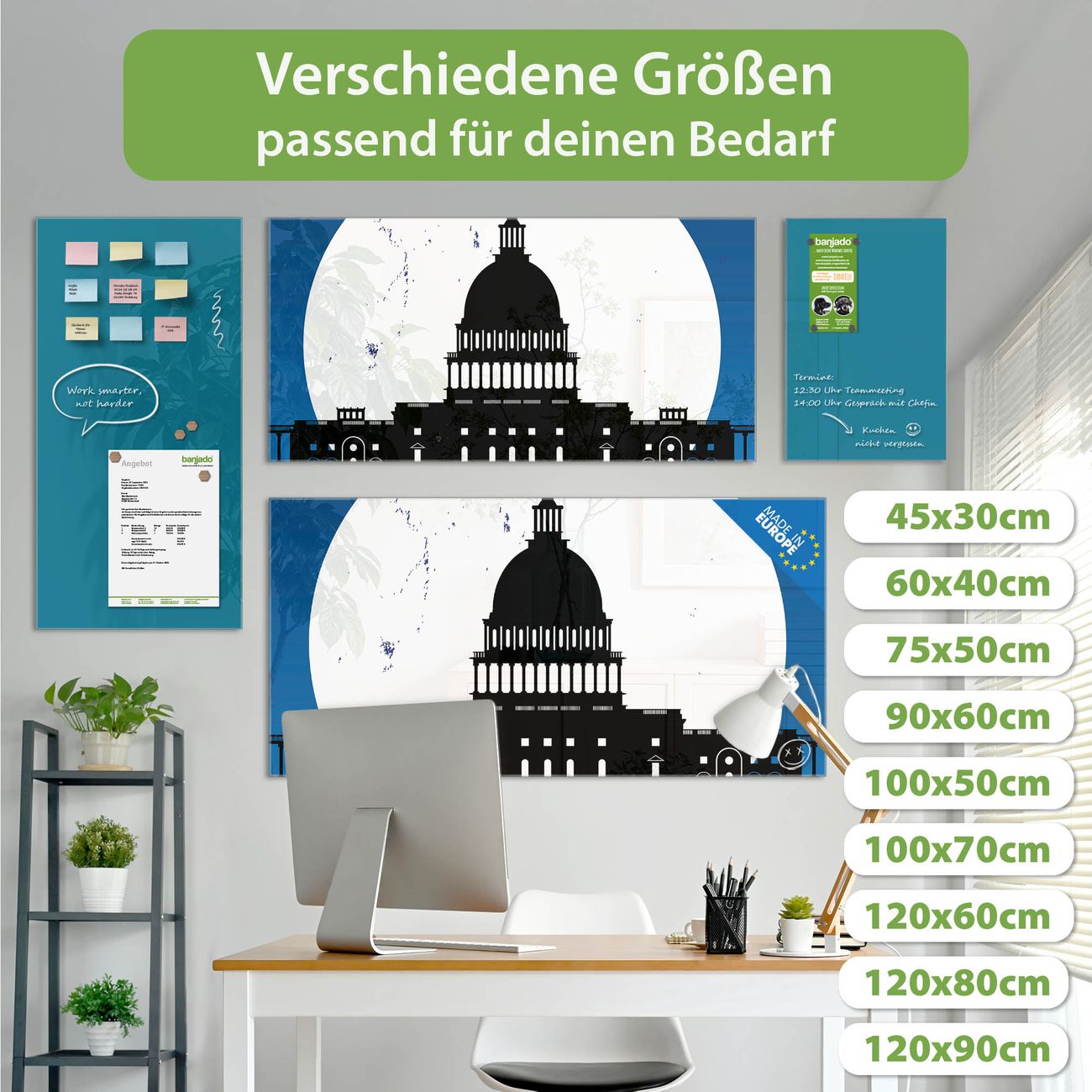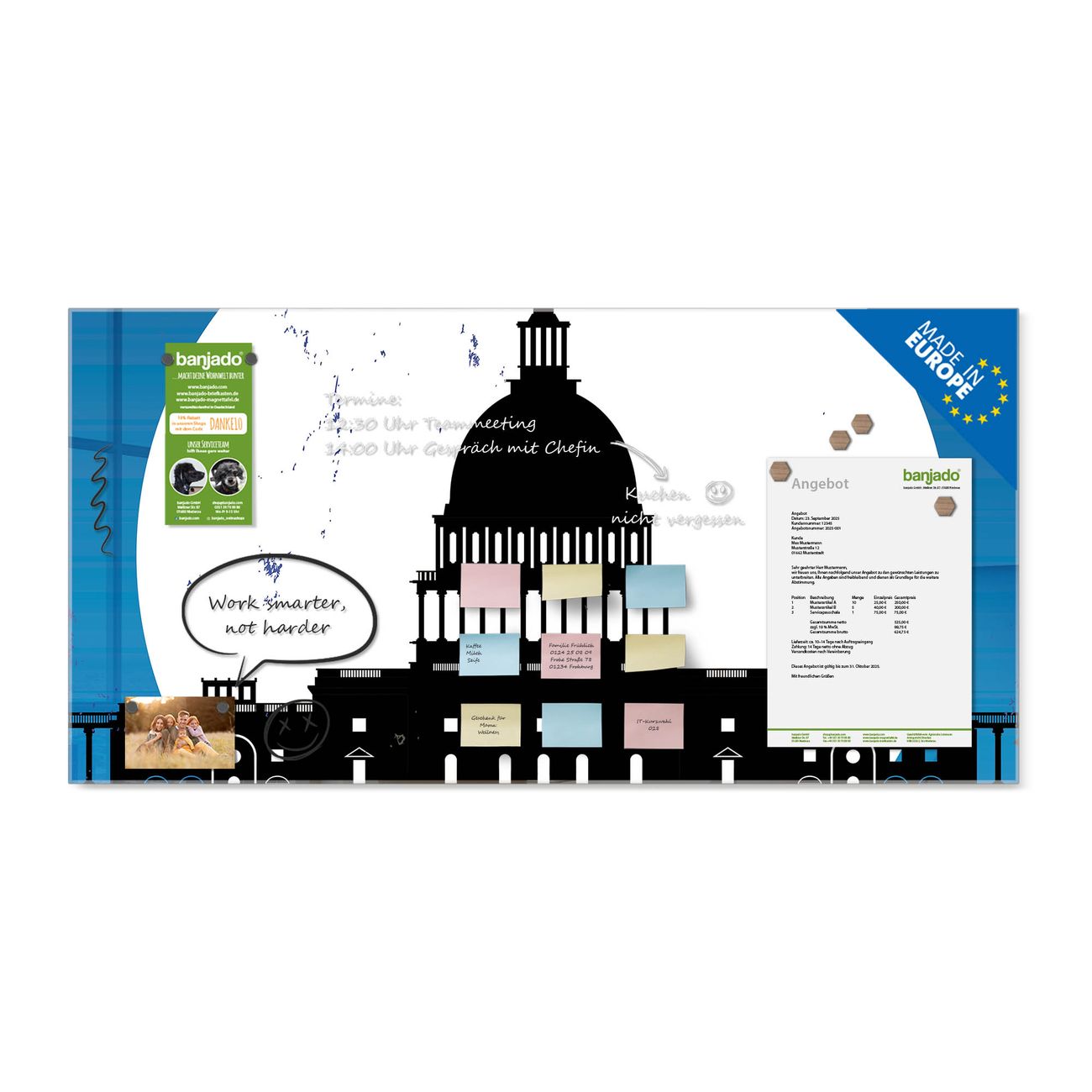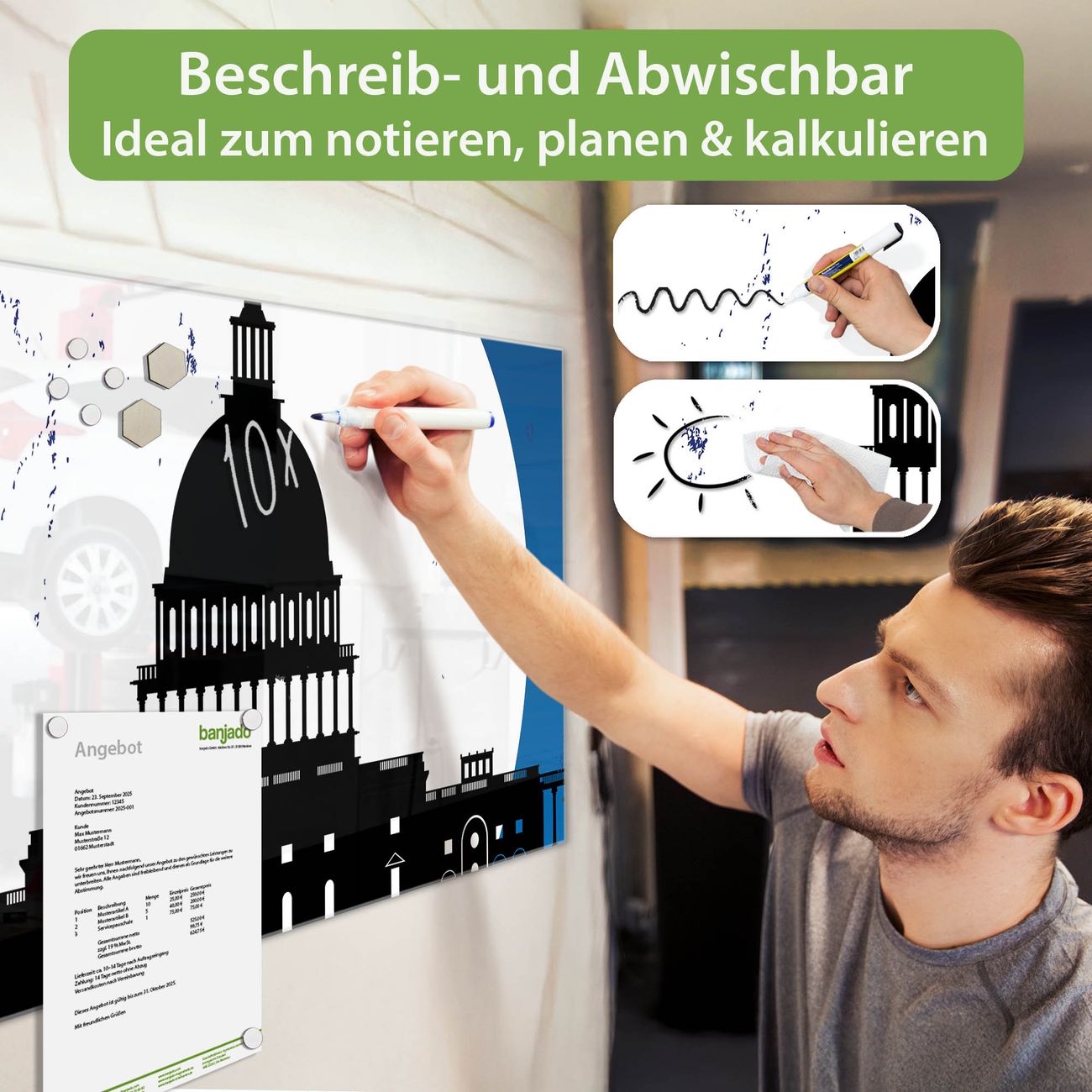 Jede Glas Magnettafel wird in unserer Werkstatt von Hand gefertigt und sorgfältig geprüft. So erhalten Sie ein echtes Qualitätsprodukt, das Funktion und Ästhetik perfekt vereint.?? Warum banjado?