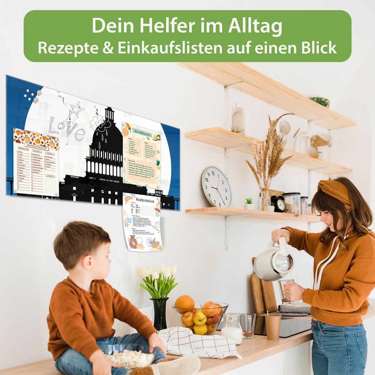 Auf der glatten Glasoberfläche lassen sich Termine, Rezepte oder Notizen ganz einfach mit Kreidestiften festhalten und rückstandslos entfernen. Starke Neodym-Magnete halten Ihre wichtigsten Erinnerungen sicher an Ort und Stelle. So entsteht Ihre ganz persönliche Ideenwand - jeden Tag neu.