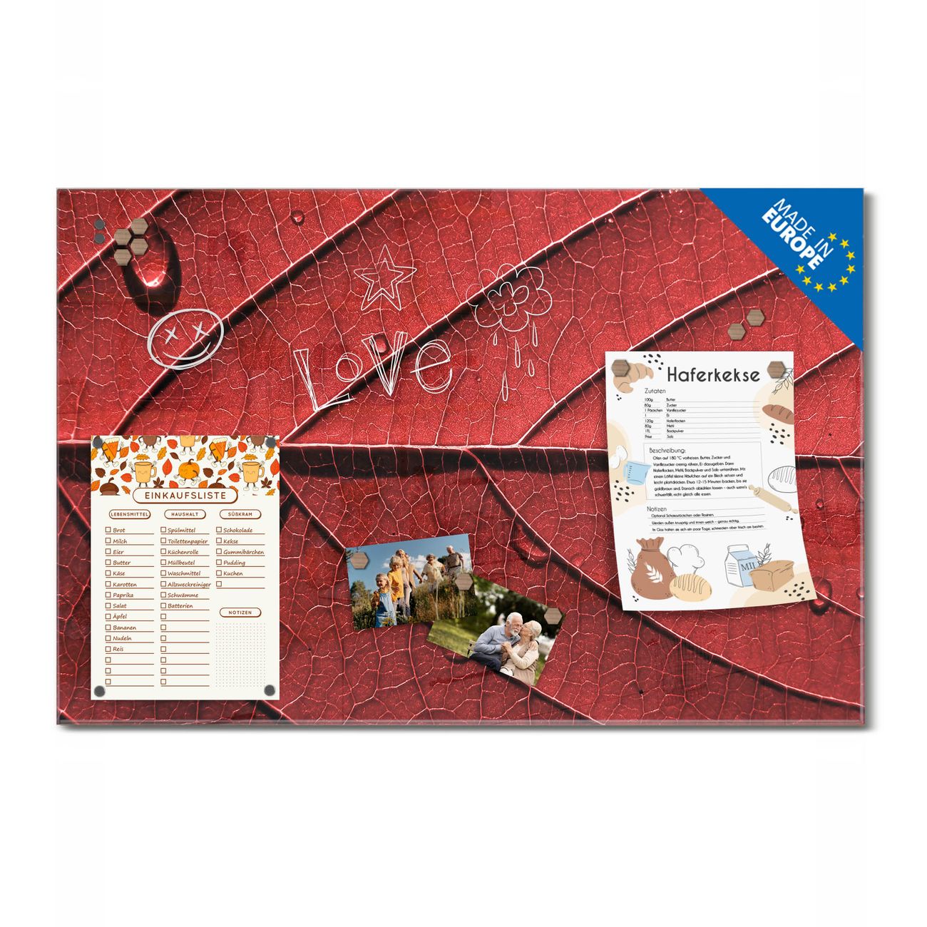 Ein Stück Design, das Ihren Alltag organisiert. Schreiben, heften, inspirieren - alles an einem Ort. Qualität, die man spürt. Montage leicht gemacht. Handwerk mit Herz - veredelt in Sachsen. Einzigartiges Design mit Motiv Motiv Detail Blatt Beschreibbare Glasoberfläche, leicht zu reinigen Starke Magnetkraft durch Stahlrückwand Inklusive 4 Neodym-Magneten Flexible Montageoptionen Handveredelt in Sachsen - Qualität, die bleibt