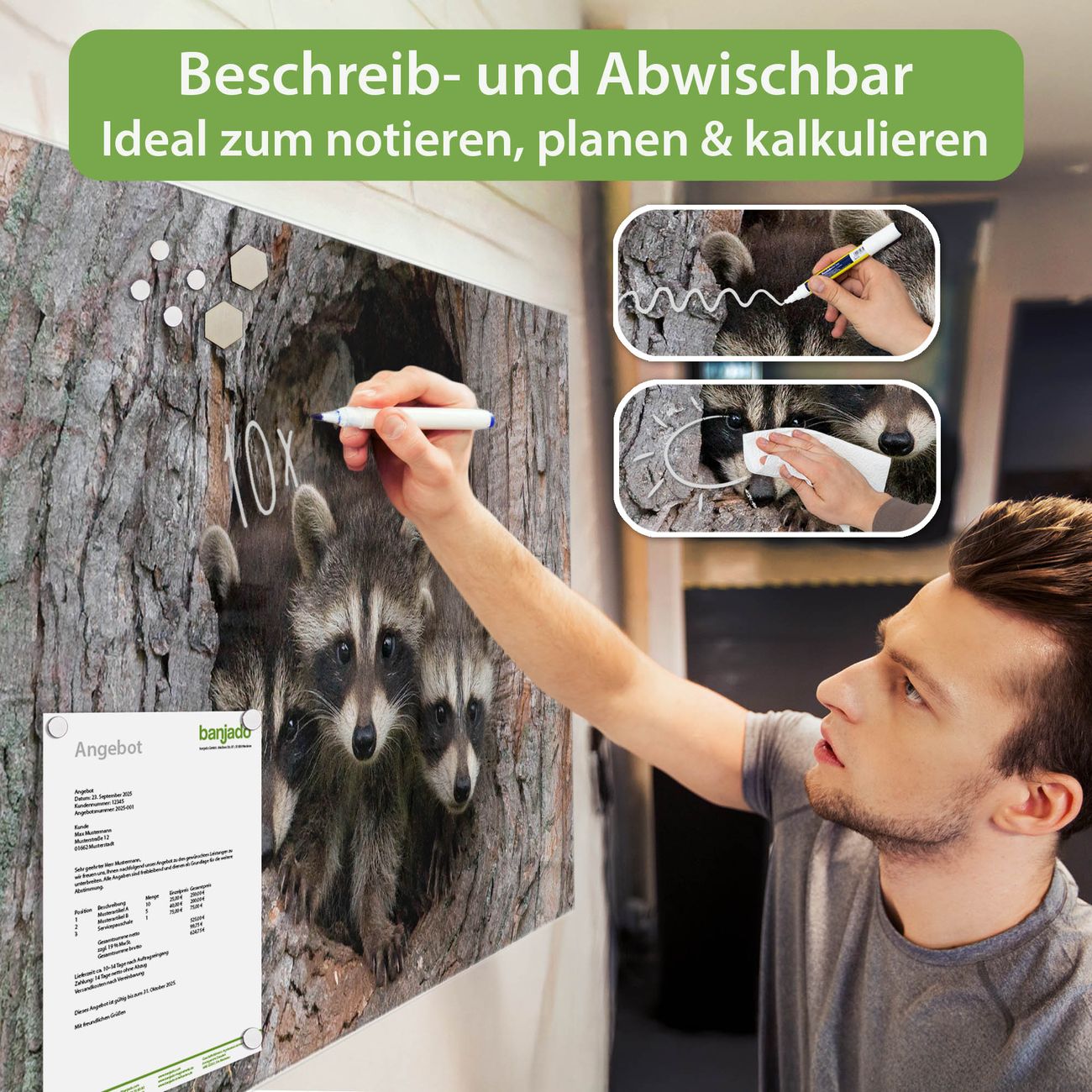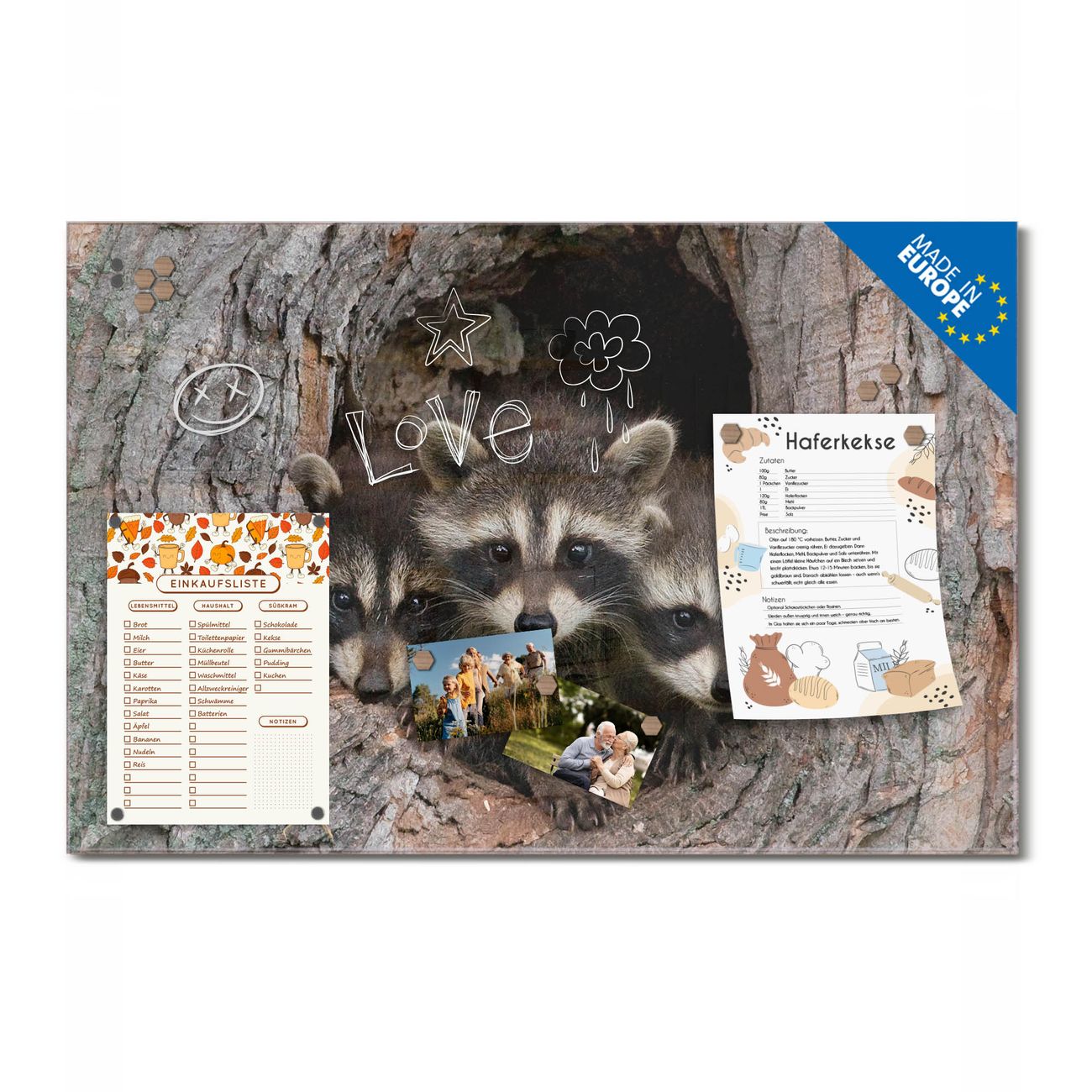Ein Stück Design, das Ihren Alltag organisiert. Schreiben, heften, inspirieren - alles an einem Ort. Qualität, die man spürt. Montage leicht gemacht. Handwerk mit Herz - veredelt in Sachsen. Einzigartiges Design mit Motiv Motiv Drei Waschbären Beschreibbare Glasoberfläche, leicht zu reinigen Starke Magnetkraft durch Stahlrückwand Inklusive 4 Neodym-Magneten Flexible Montageoptionen Handveredelt in Sachsen - Qualität, die bleibt