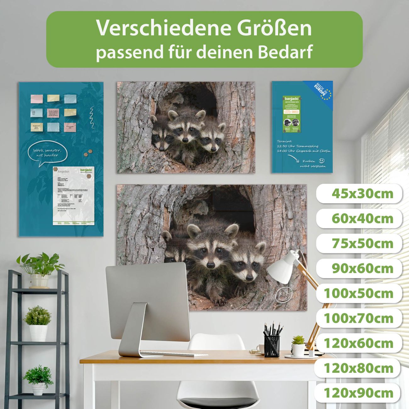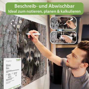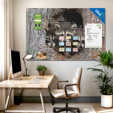 Die banjado Glas Magnettafel mit dem Motiv Motiv Drei Waschbären verbindet Funktionalität mit Stil. Sie ersetzt das Zettelchaos durch klare Strukturen und bringt dabei eine warme, natürliche Atmosphäre in Ihr Zuhause. Ob im Büro, in der Küche oder im Eingangsbereich - dieses Design-Board zieht Blicke an und sorgt für Ordnung mit Charakter.