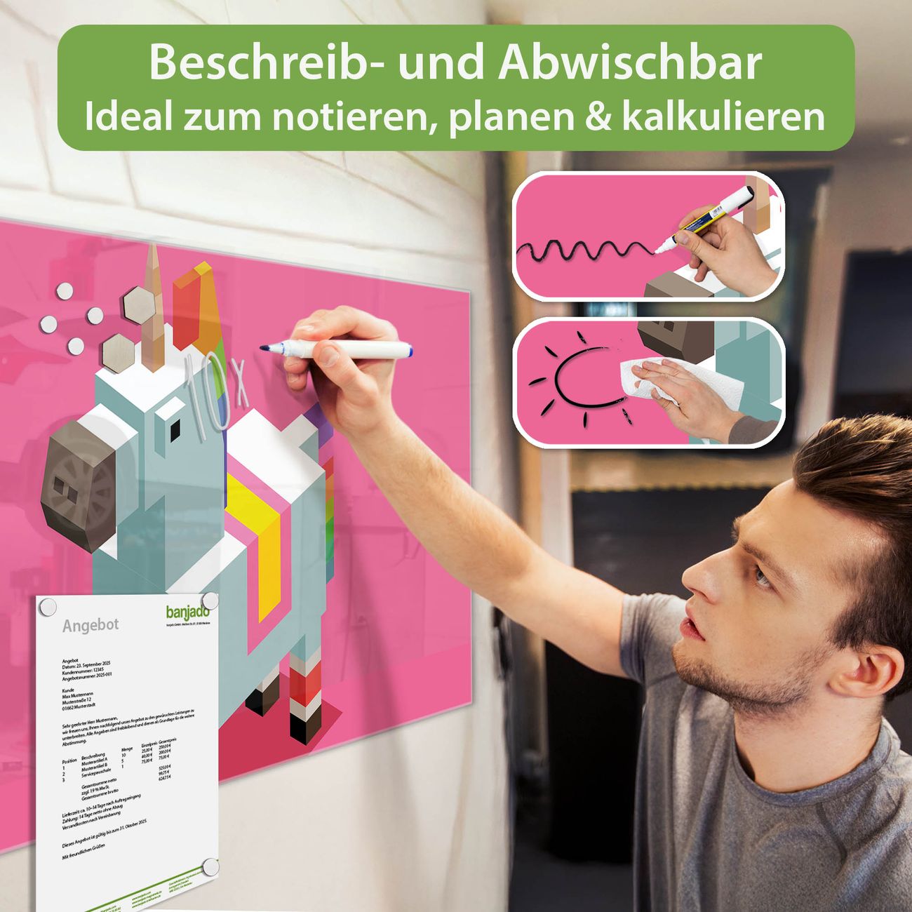 Die banjado Glas Magnettafel mit dem Motiv Motiv Einhorn Block verbindet Funktionalität mit Stil. Sie ersetzt das Zettelchaos durch klare Strukturen und bringt dabei eine warme, natürliche Atmosphäre in Ihr Zuhause. Ob im Büro, in der Küche oder im Eingangsbereich - dieses Design-Board zieht Blicke an und sorgt für Ordnung mit Charakter.