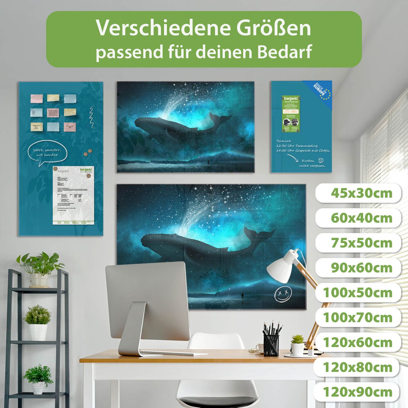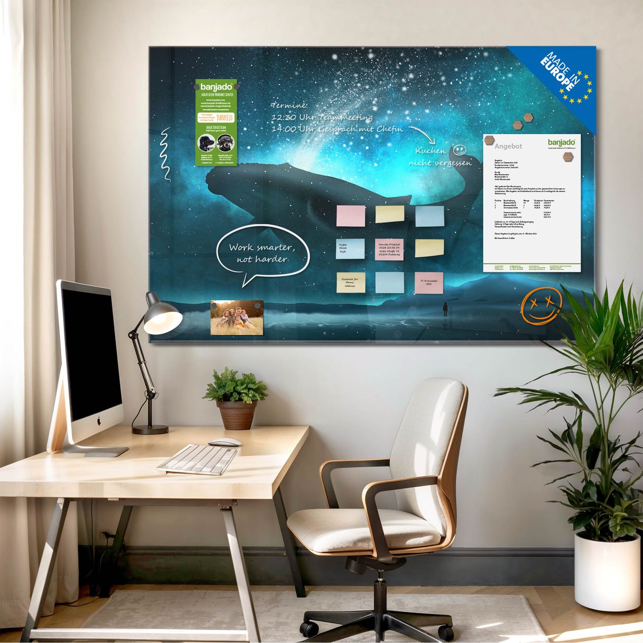 Jede Glas Magnettafel wird in unserer Werkstatt von Hand gefertigt und sorgfältig geprüft. So erhalten Sie ein echtes Qualitätsprodukt, das Funktion und Ästhetik perfekt vereint.?? Warum banjado?