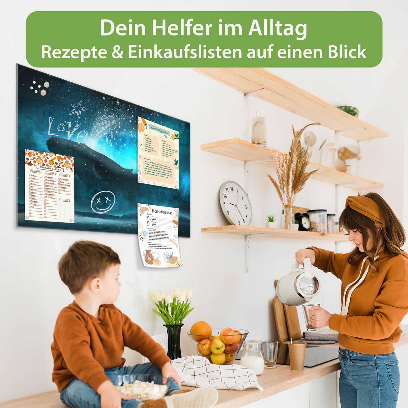 Auf der glatten Glasoberfläche lassen sich Termine, Rezepte oder Notizen ganz einfach mit Kreidestiften festhalten und rückstandslos entfernen. Starke Neodym-Magnete halten Ihre wichtigsten Erinnerungen sicher an Ort und Stelle. So entsteht Ihre ganz persönliche Ideenwand - jeden Tag neu.