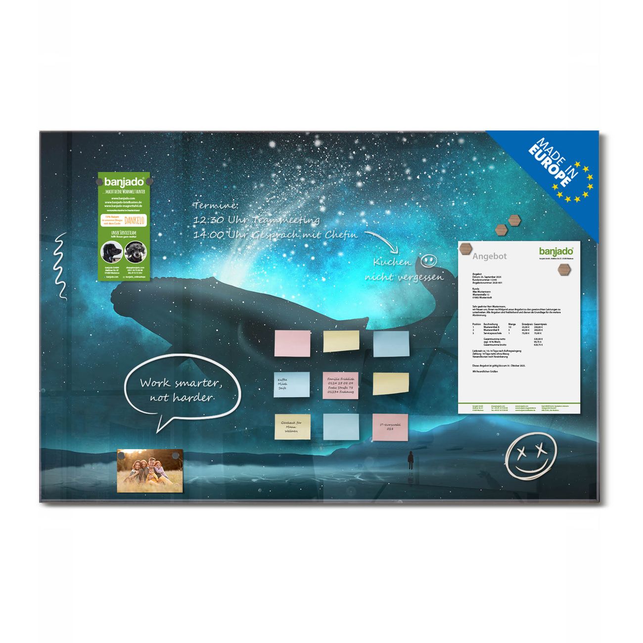 Jede Glas Magnettafel wird in unserer Werkstatt von Hand gefertigt und sorgfältig geprüft. So erhalten Sie ein echtes Qualitätsprodukt, das Funktion und Ästhetik perfekt vereint.?? Warum banjado?