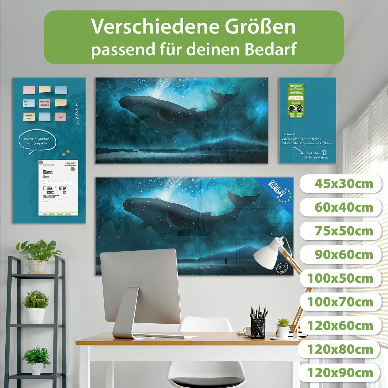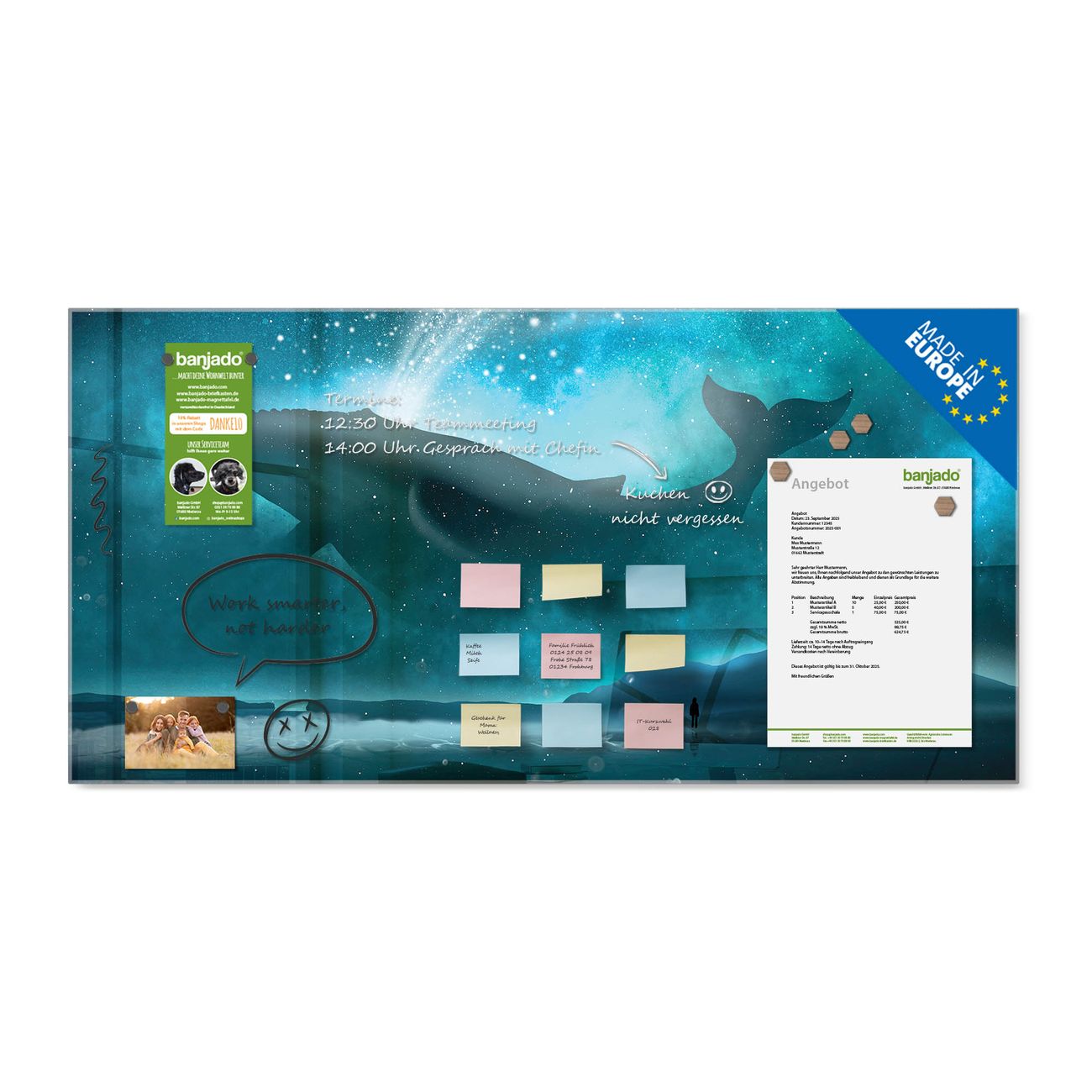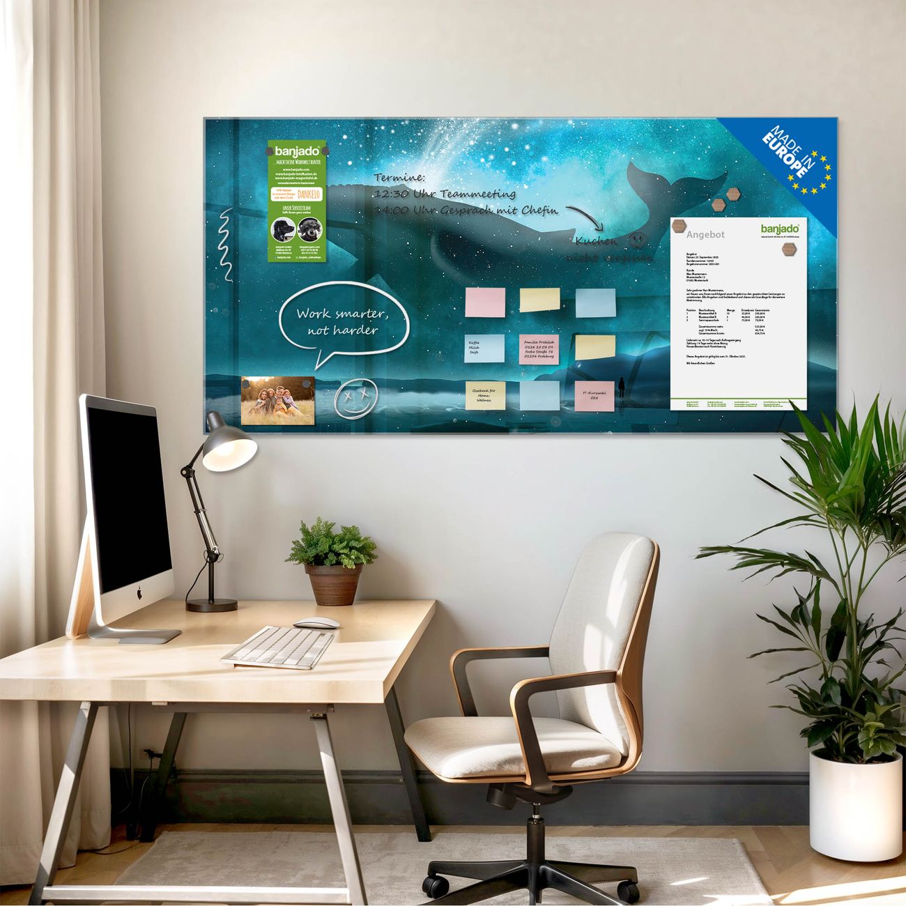 Jede Glas Magnettafel wird in unserer Werkstatt von Hand gefertigt und sorgfältig geprüft. So erhalten Sie ein echtes Qualitätsprodukt, das Funktion und Ästhetik perfekt vereint.?? Warum banjado?