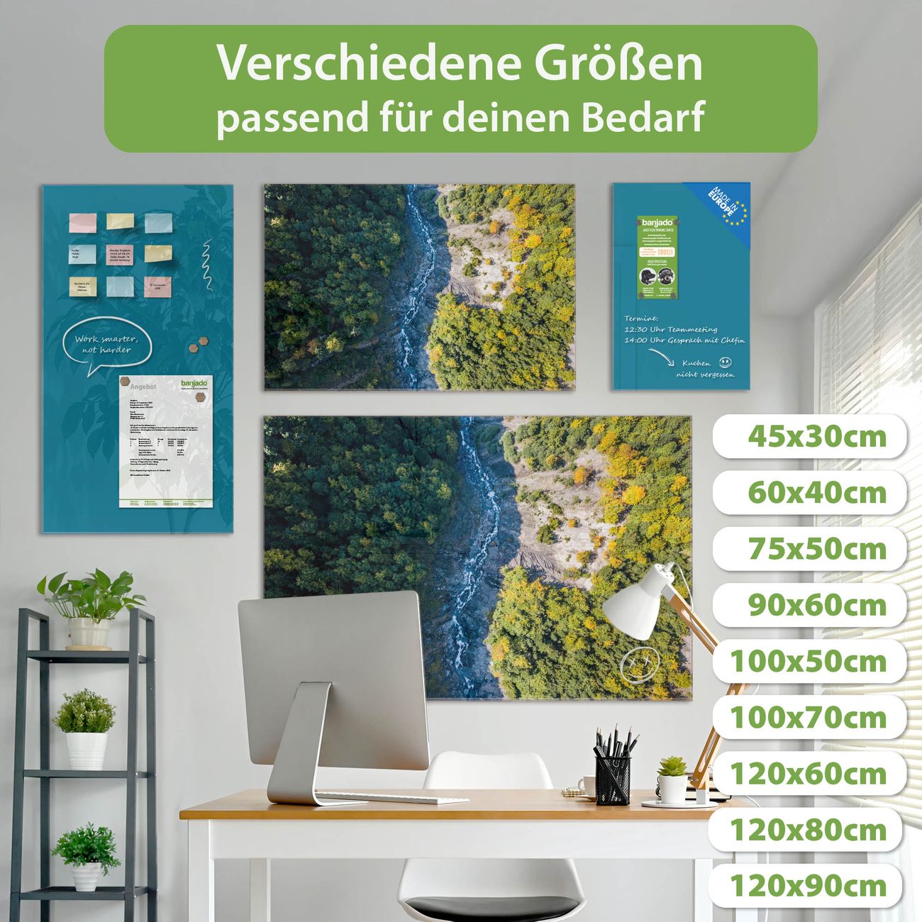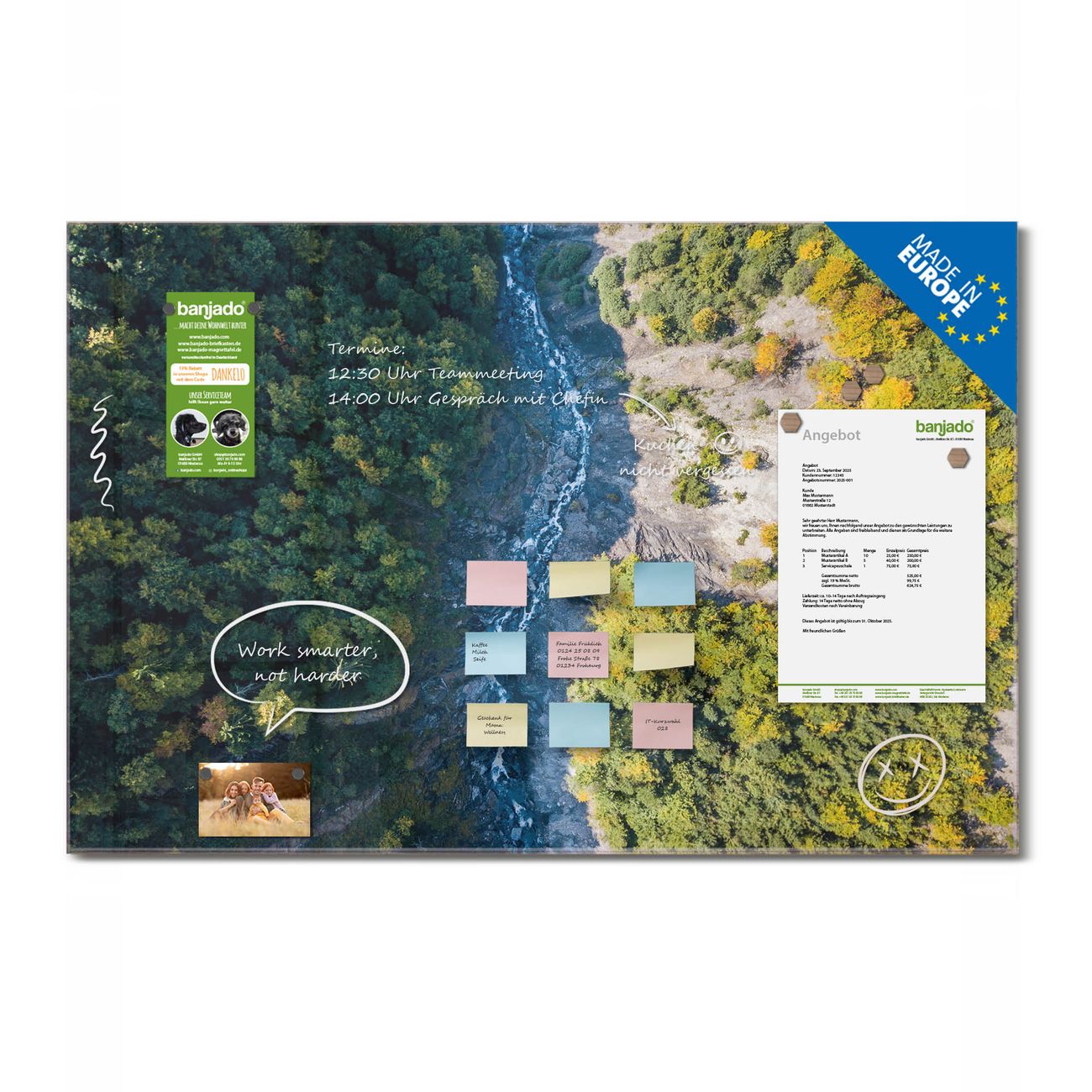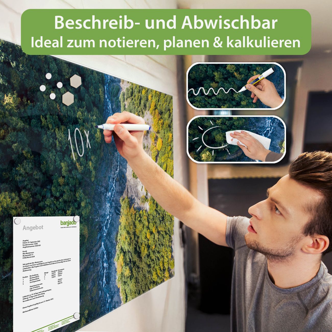 Jede Glas Magnettafel wird in unserer Werkstatt von Hand gefertigt und sorgfältig geprüft. So erhalten Sie ein echtes Qualitätsprodukt, das Funktion und Ästhetik perfekt vereint.?? Warum banjado?
