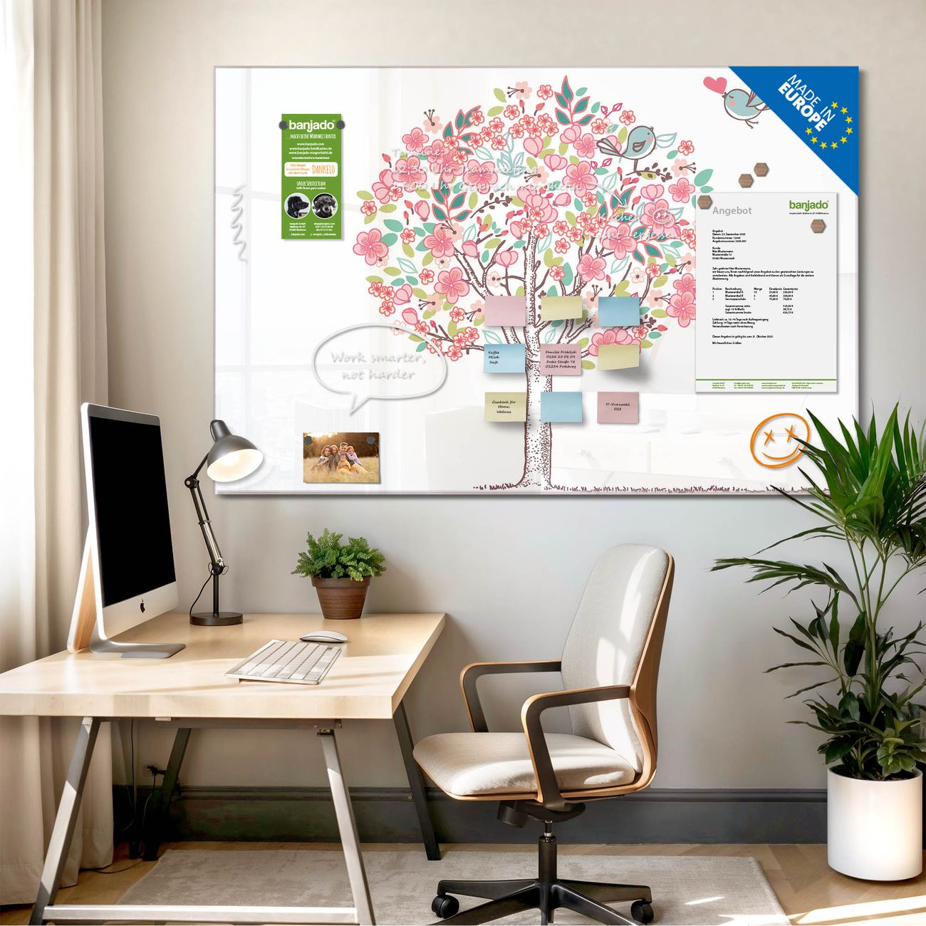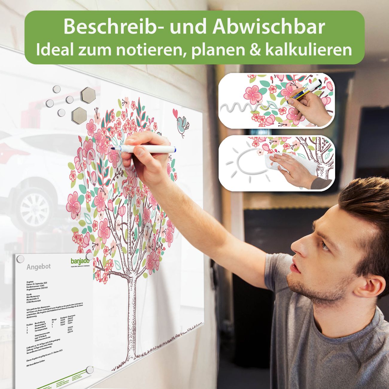 Jede Glas Magnettafel wird in unserer Werkstatt von Hand gefertigt und sorgfältig geprüft. So erhalten Sie ein echtes Qualitätsprodukt, das Funktion und Ästhetik perfekt vereint.?? Warum banjado?