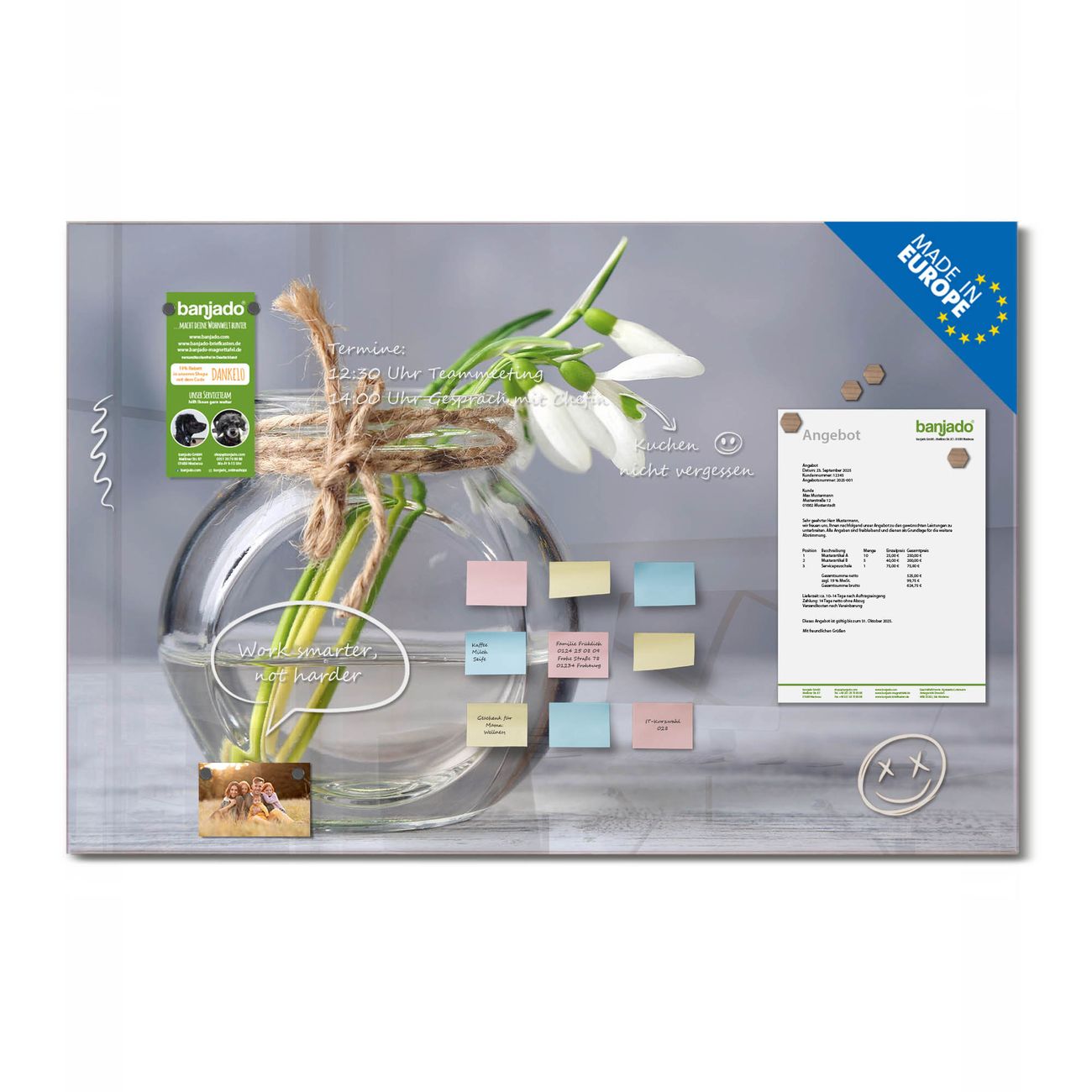 Jede Glas Magnettafel wird in unserer Werkstatt von Hand gefertigt und sorgfältig geprüft. So erhalten Sie ein echtes Qualitätsprodukt, das Funktion und Ästhetik perfekt vereint.?? Warum banjado?