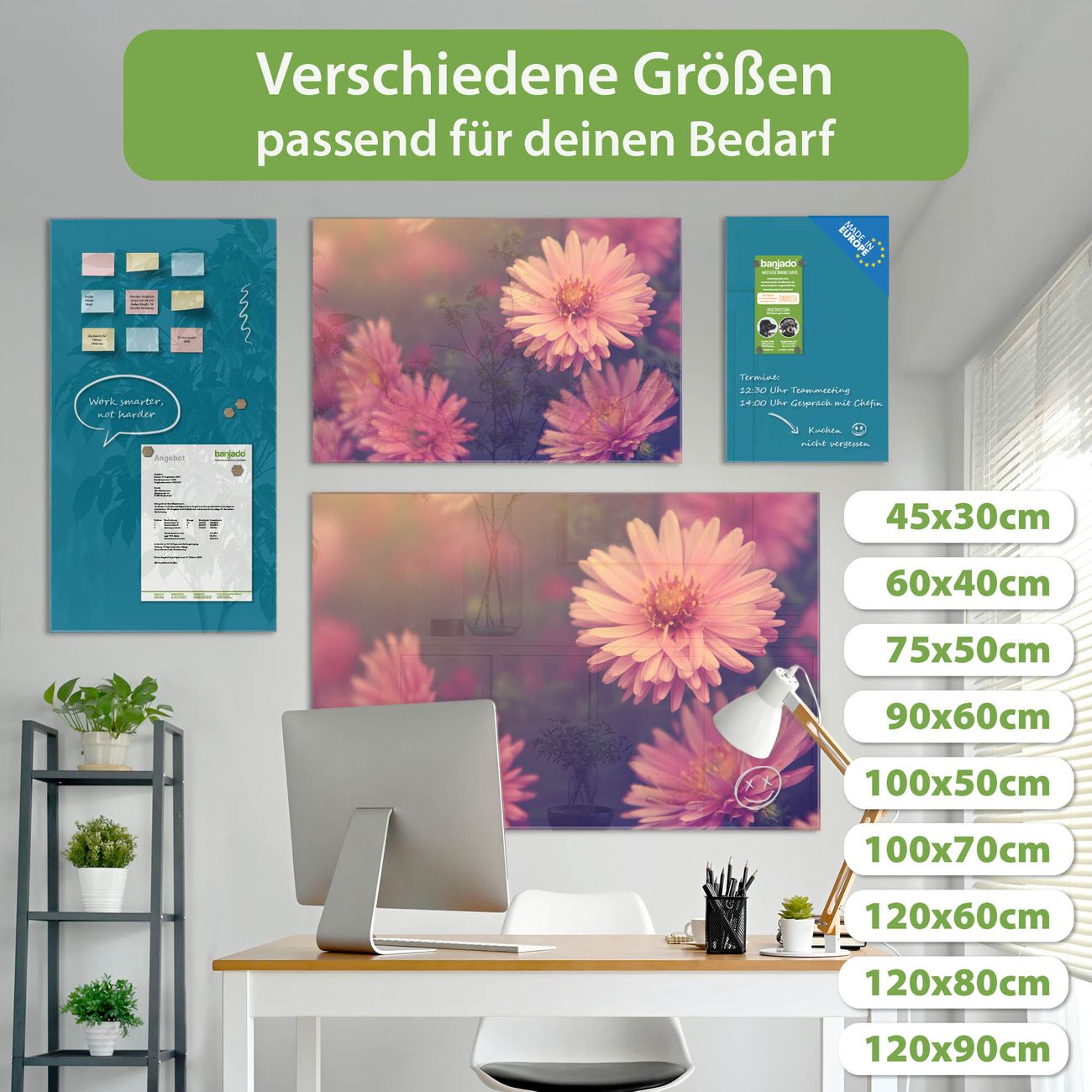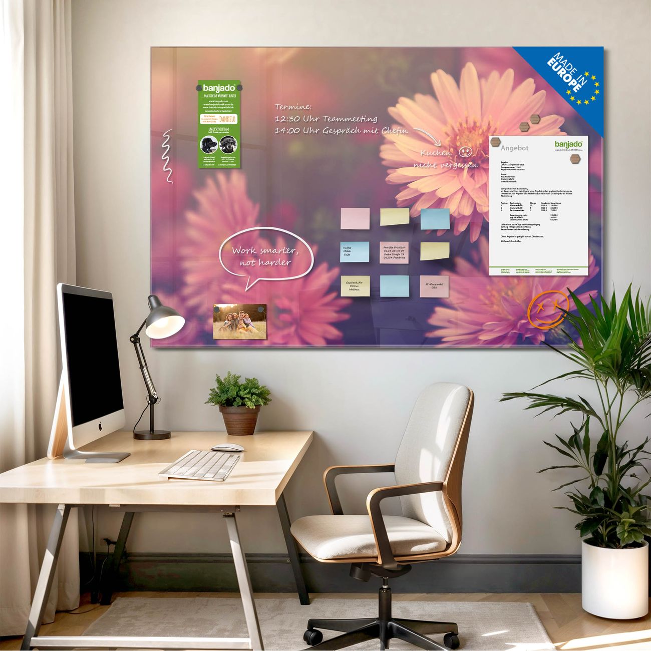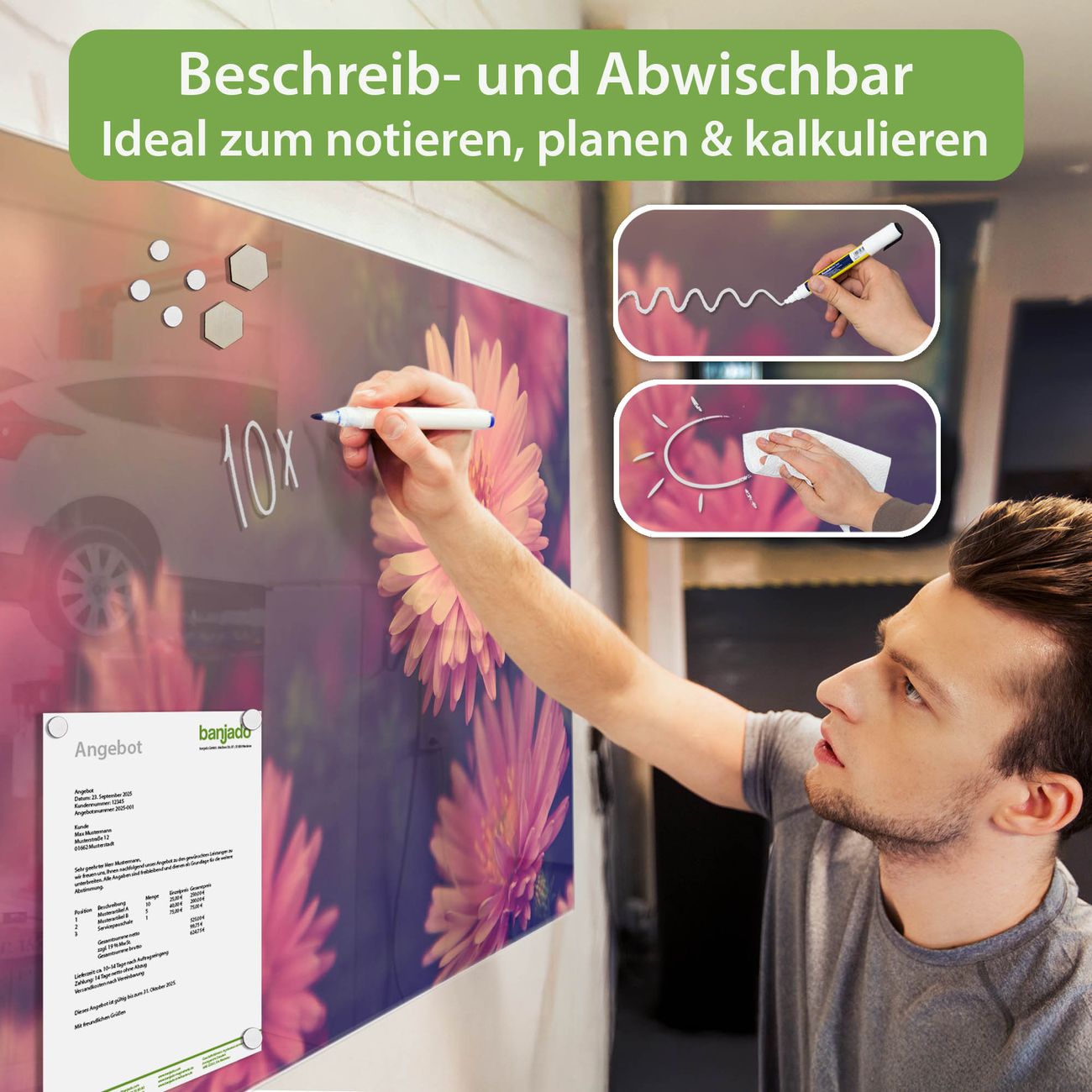 Jede Glas Magnettafel wird in unserer Werkstatt von Hand gefertigt und sorgfältig geprüft. So erhalten Sie ein echtes Qualitätsprodukt, das Funktion und Ästhetik perfekt vereint.?? Warum banjado?