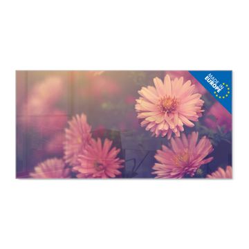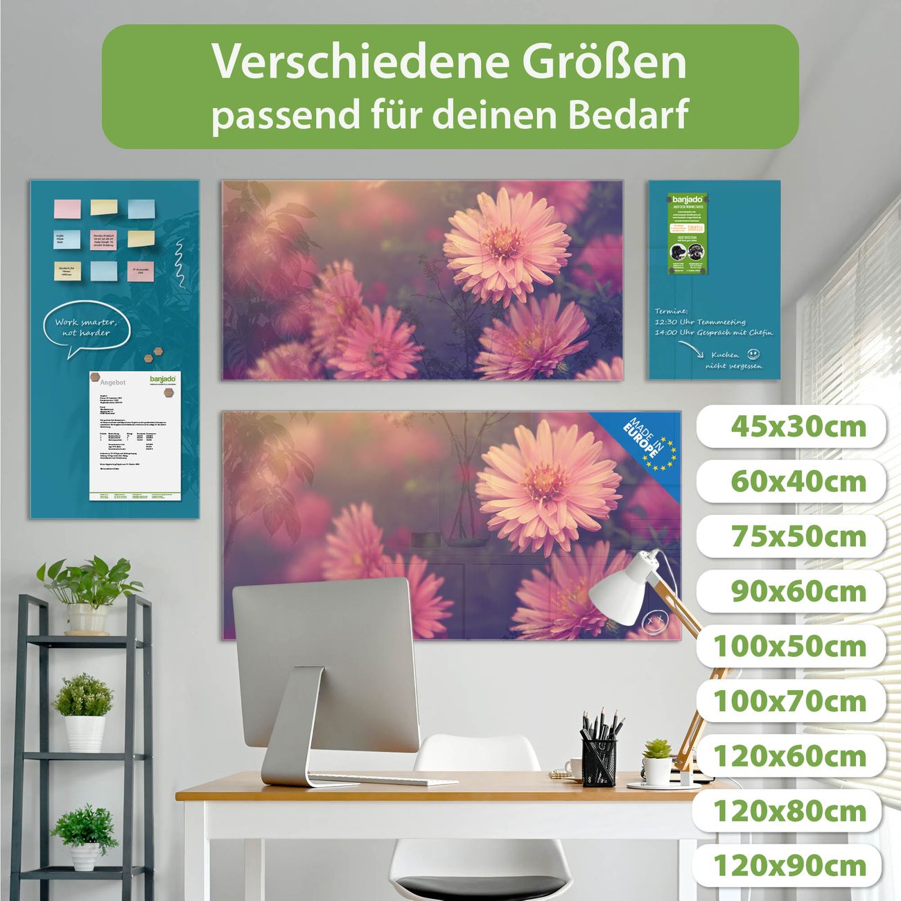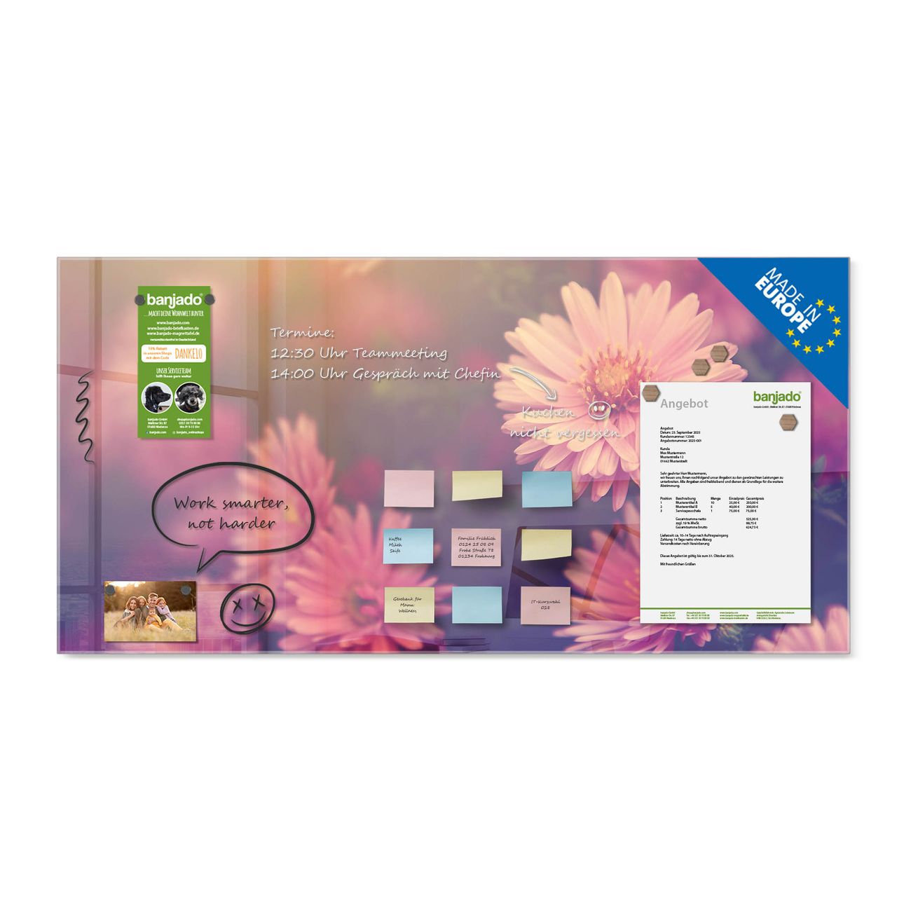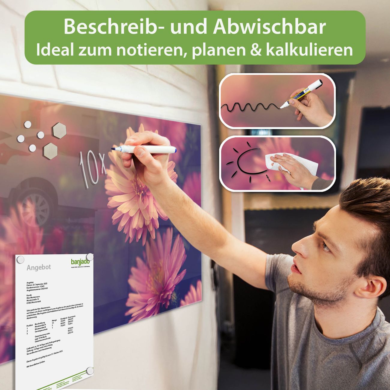Material: 4mm Sicherheitsglas mit Metallrückwand Eigenschaften: beschreibbar, magnetisch, kratzfest Maße: 100x50x0,6cm, 7,50kg schwer Motiv Nummer 12046 Gerbera 2 Zubehör: inklusive 4 Neodym-Magnete