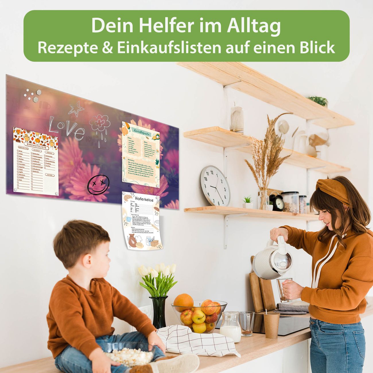 Auf der glatten Glasoberfläche lassen sich Termine, Rezepte oder Notizen ganz einfach mit Kreidestiften festhalten und rückstandslos entfernen. Starke Neodym-Magnete halten Ihre wichtigsten Erinnerungen sicher an Ort und Stelle. So entsteht Ihre ganz persönliche Ideenwand - jeden Tag neu.