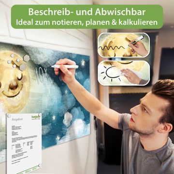 Auf der glatten Glasoberfläche lassen sich Termine, Rezepte oder Notizen ganz einfach mit Kreidestiften festhalten und rückstandslos entfernen. Starke Neodym-Magnete halten Ihre wichtigsten Erinnerungen sicher an Ort und Stelle. So entsteht Ihre ganz persönliche Ideenwand - jeden Tag neu.