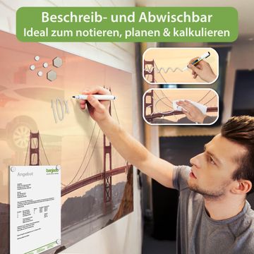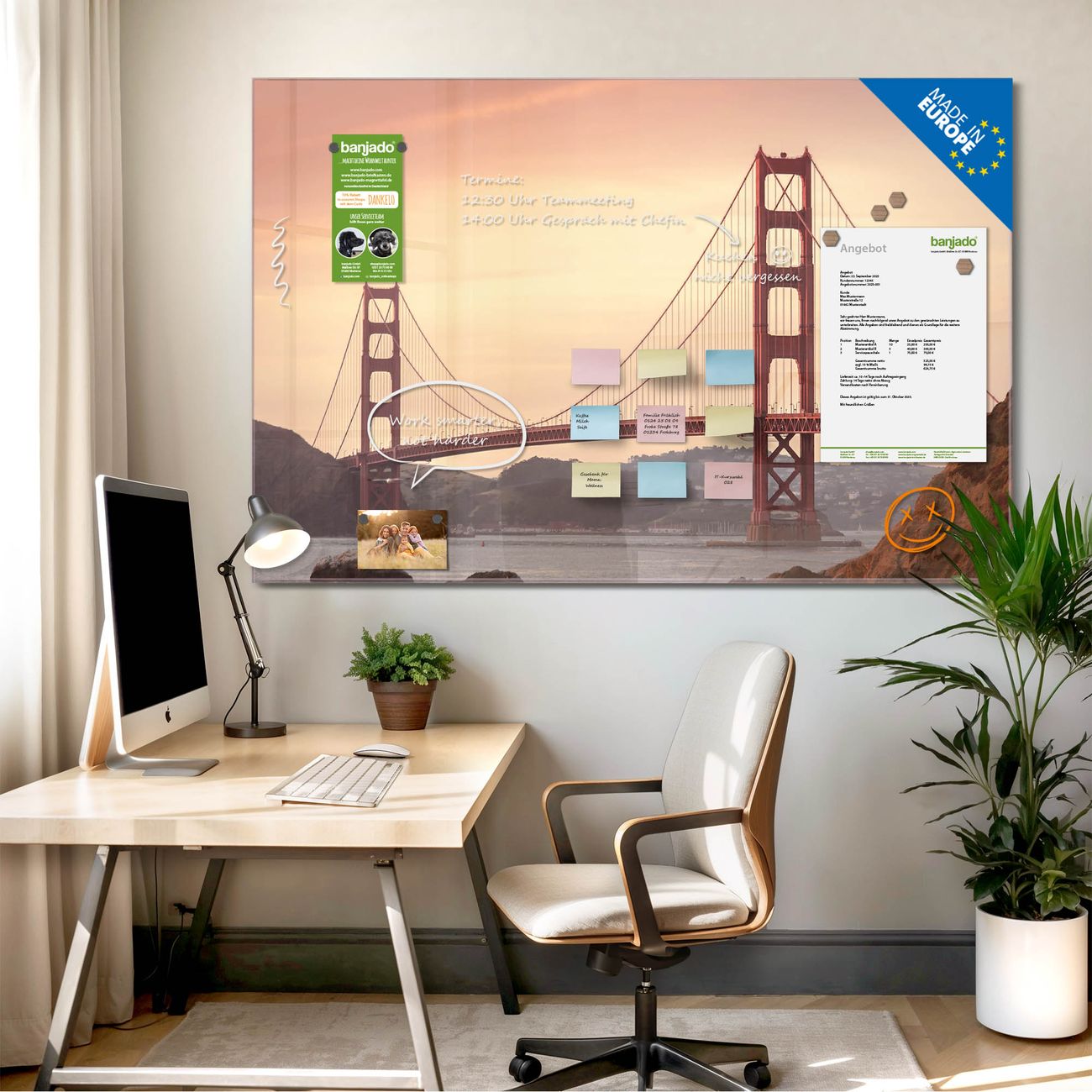 Die banjado Glas Magnettafel mit dem Motiv Motiv Golden Gate Bridge 2 verbindet Funktionalität mit Stil. Sie ersetzt das Zettelchaos durch klare Strukturen und bringt dabei eine warme, natürliche Atmosphäre in Ihr Zuhause. Ob im Büro, in der Küche oder im Eingangsbereich - dieses Design-Board zieht Blicke an und sorgt für Ordnung mit Charakter.