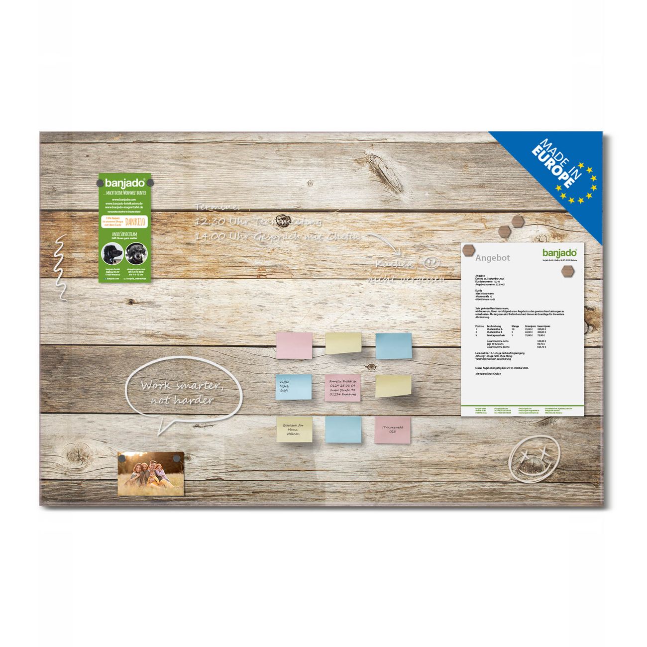 Jede Glas Magnettafel wird in unserer Werkstatt von Hand gefertigt und sorgfältig geprüft. So erhalten Sie ein echtes Qualitätsprodukt, das Funktion und Ästhetik perfekt vereint.?? Warum banjado?