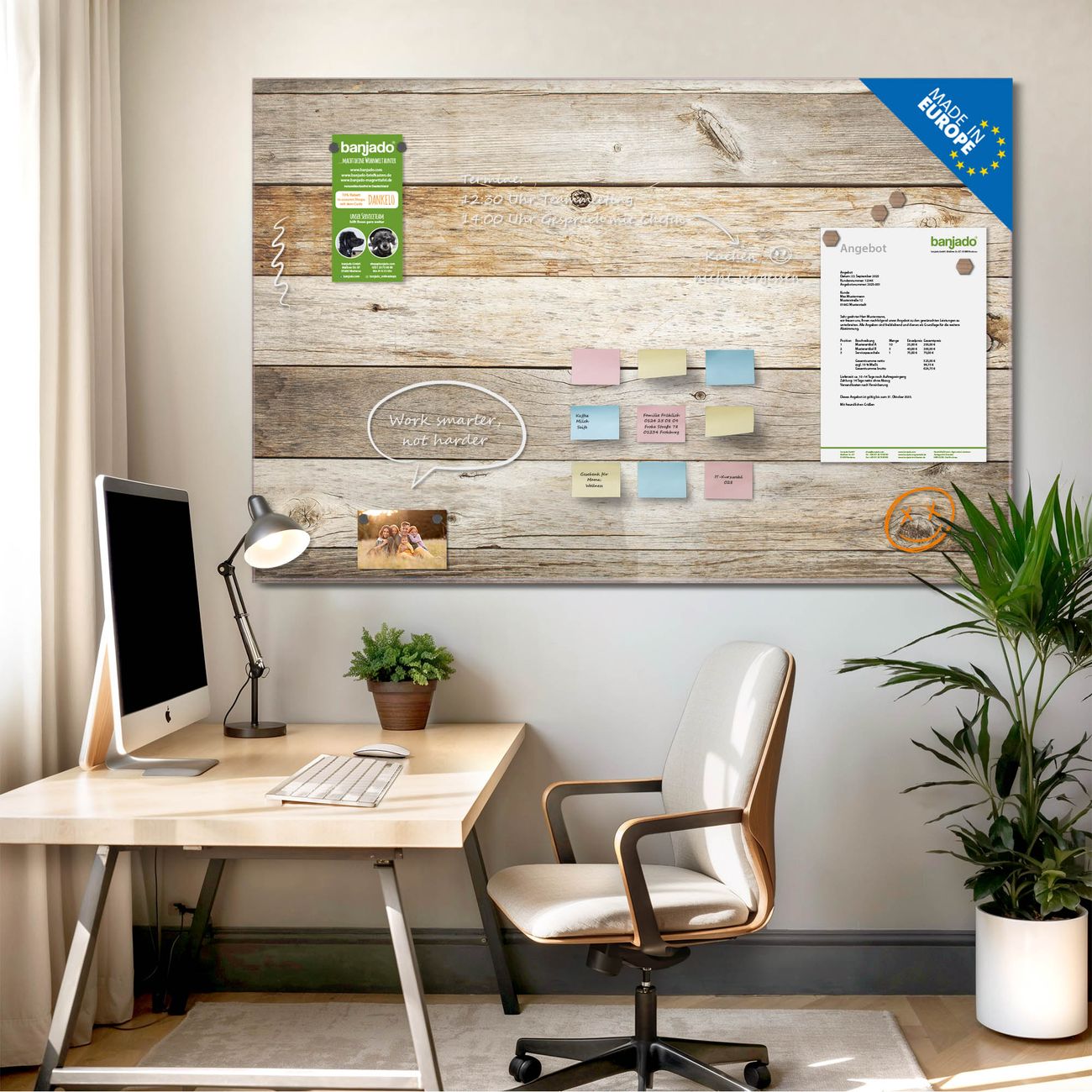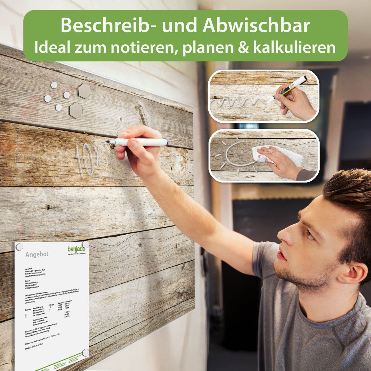 Jede Glas Magnettafel wird in unserer Werkstatt von Hand gefertigt und sorgfältig geprüft. So erhalten Sie ein echtes Qualitätsprodukt, das Funktion und Ästhetik perfekt vereint.?? Warum banjado?