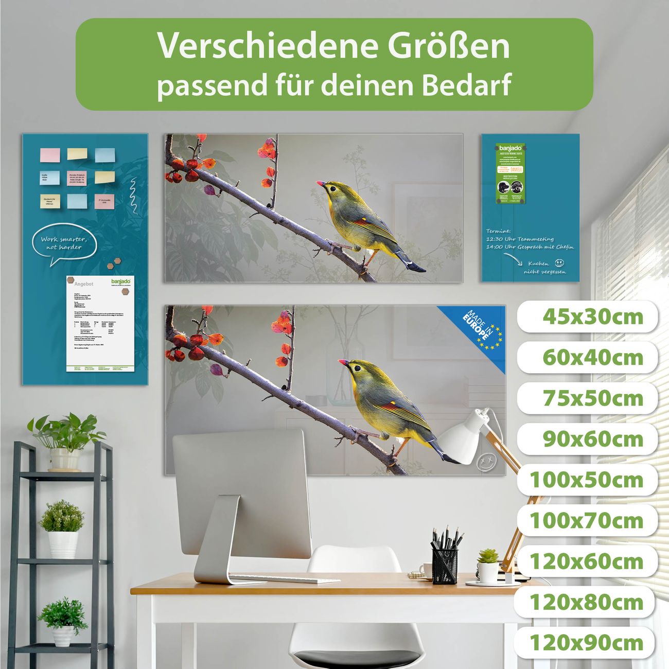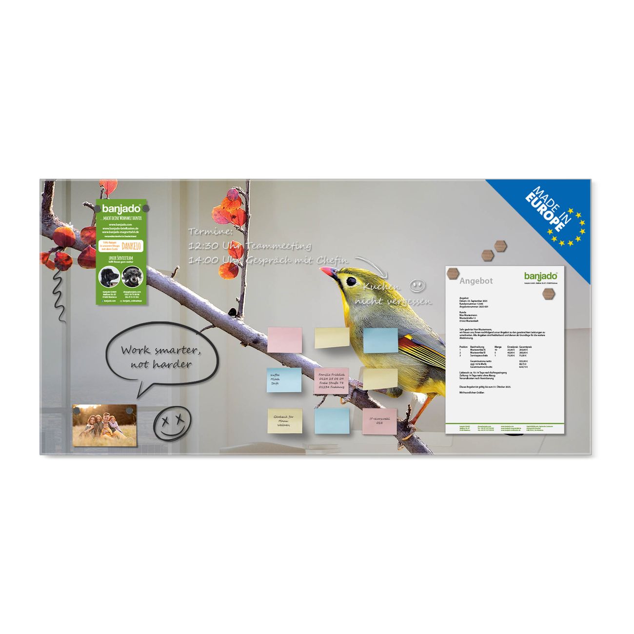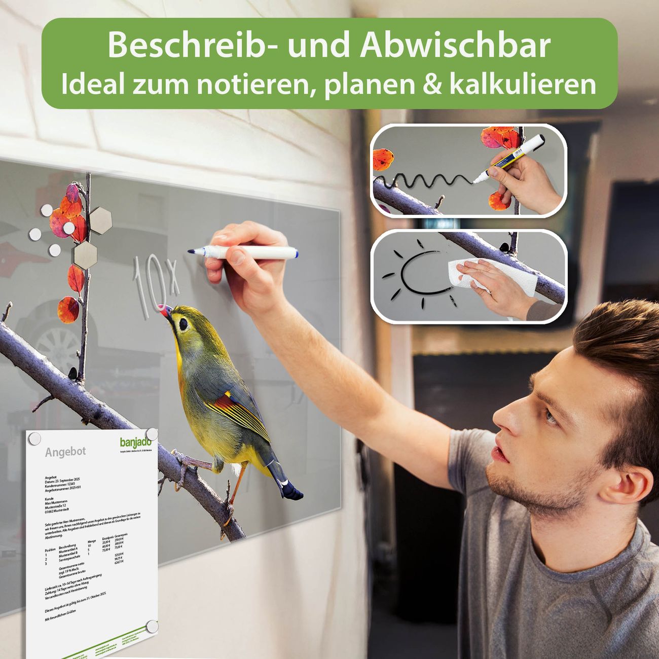 Jede Glas Magnettafel wird in unserer Werkstatt von Hand gefertigt und sorgfältig geprüft. So erhalten Sie ein echtes Qualitätsprodukt, das Funktion und Ästhetik perfekt vereint.?? Warum banjado?