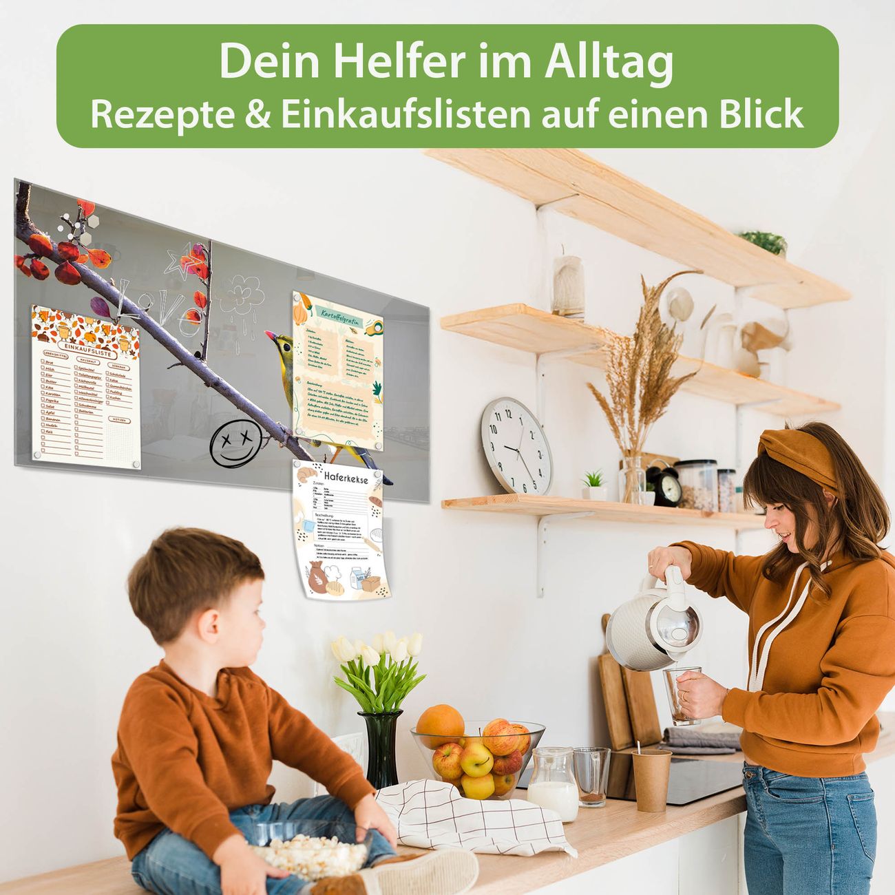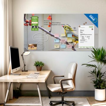 Auf der glatten Glasoberfläche lassen sich Termine, Rezepte oder Notizen ganz einfach mit Kreidestiften festhalten und rückstandslos entfernen. Starke Neodym-Magnete halten Ihre wichtigsten Erinnerungen sicher an Ort und Stelle. So entsteht Ihre ganz persönliche Ideenwand - jeden Tag neu.
