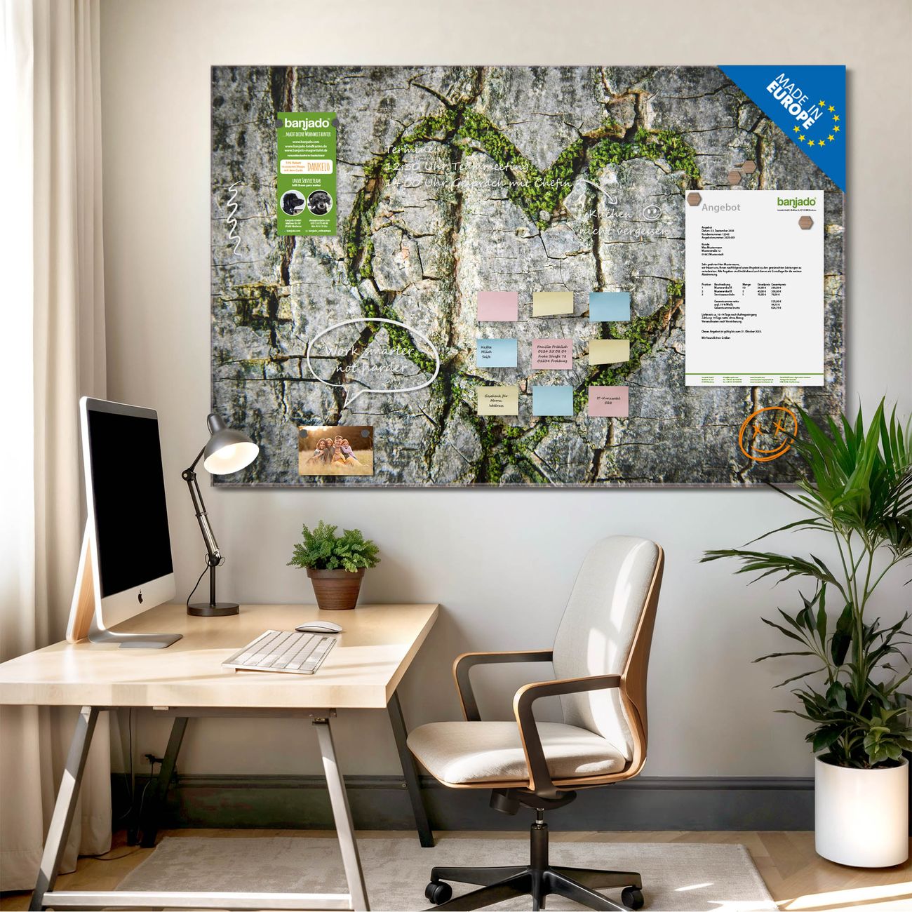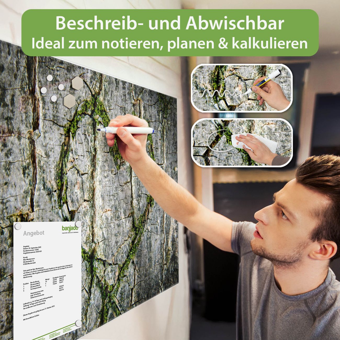 Jede Glas Magnettafel wird in unserer Werkstatt von Hand gefertigt und sorgfältig geprüft. So erhalten Sie ein echtes Qualitätsprodukt, das Funktion und Ästhetik perfekt vereint.?? Warum banjado?