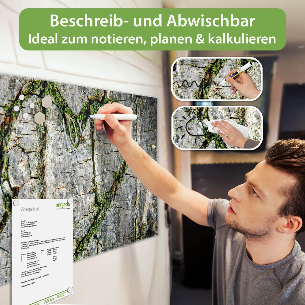 Auf der glatten Glasoberfläche lassen sich Termine, Rezepte oder Notizen ganz einfach mit Kreidestiften festhalten und rückstandslos entfernen. Starke Neodym-Magnete halten Ihre wichtigsten Erinnerungen sicher an Ort und Stelle. So entsteht Ihre ganz persönliche Ideenwand - jeden Tag neu.