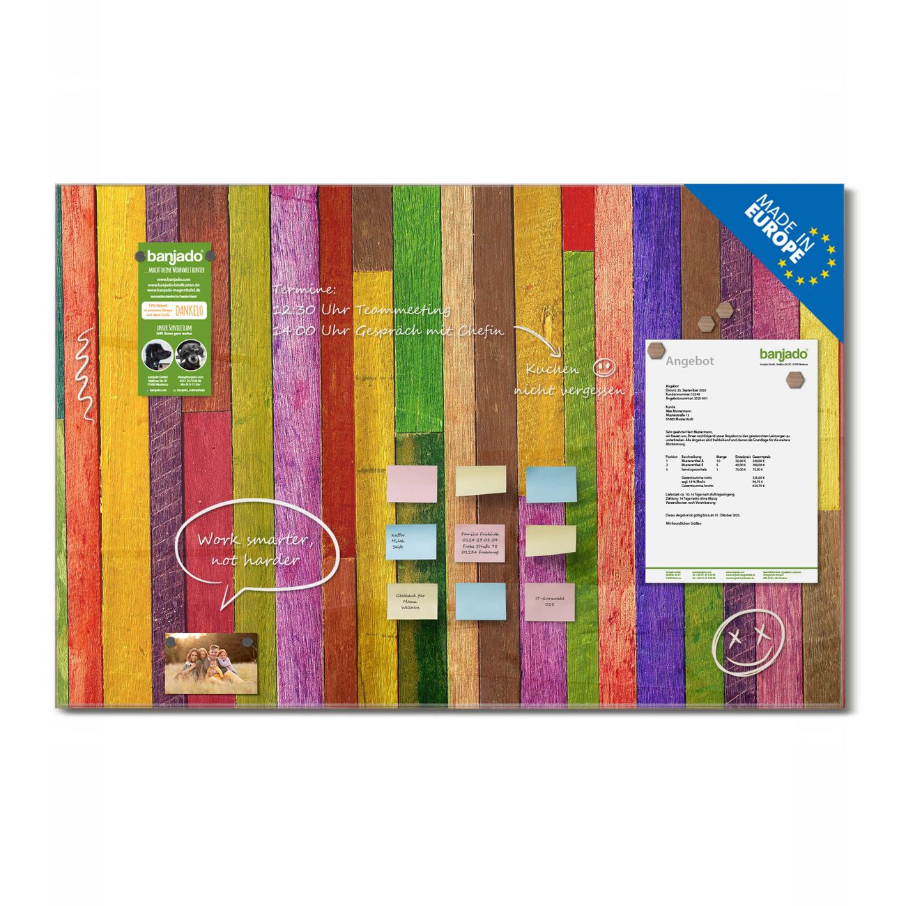 Jede Glas Magnettafel wird in unserer Werkstatt von Hand gefertigt und sorgfältig geprüft. So erhalten Sie ein echtes Qualitätsprodukt, das Funktion und Ästhetik perfekt vereint.?? Warum banjado?