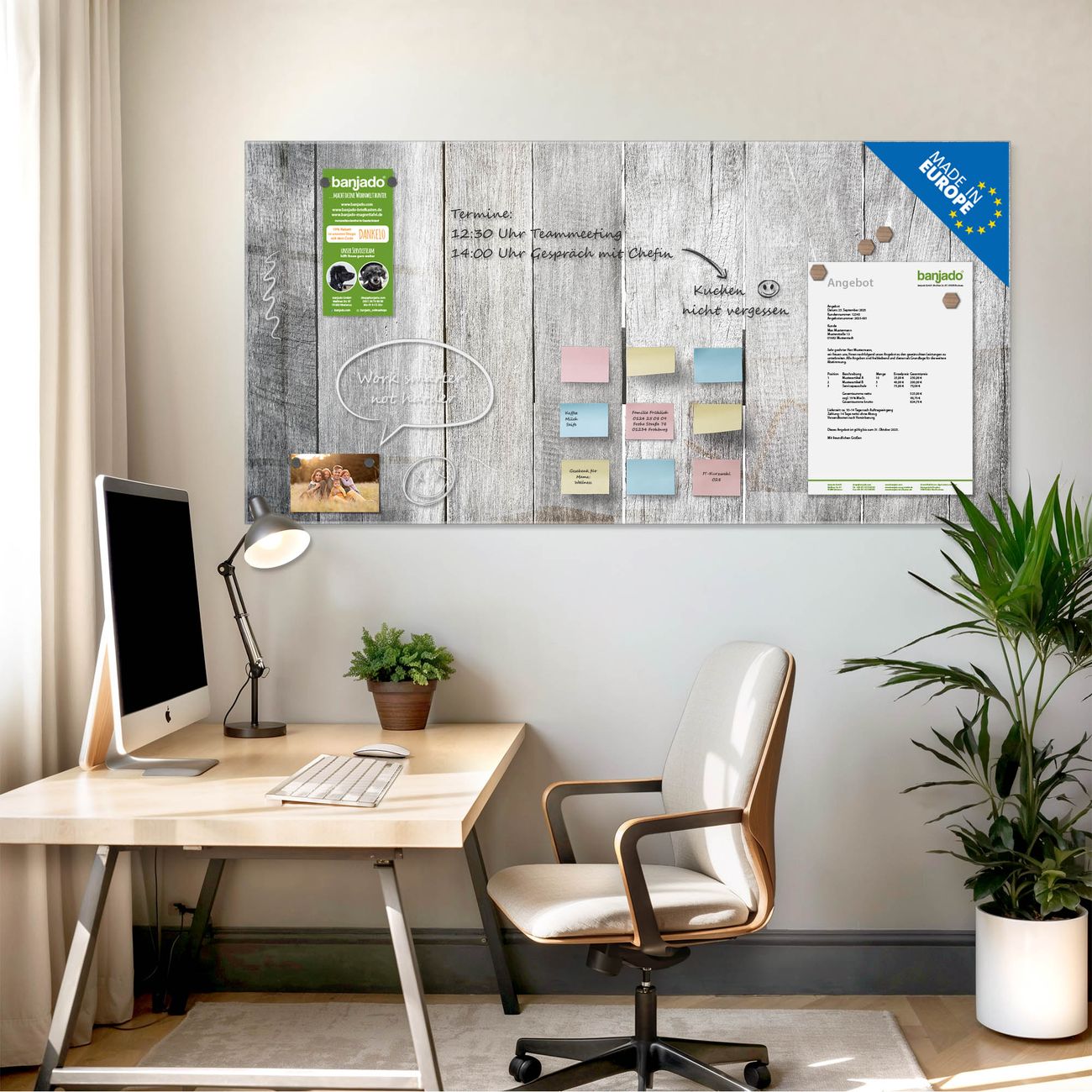 Ein Stück Design, das Ihren Alltag organisiert. Schreiben, heften, inspirieren - alles an einem Ort. Qualität, die man spürt. Montage leicht gemacht. Handwerk mit Herz - veredelt in Sachsen. Einzigartiges Design mit Motiv Motiv Holz Monochrom Beschreibbare Glasoberfläche, leicht zu reinigen Starke Magnetkraft durch Stahlrückwand Inklusive 4 Neodym-Magneten Flexible Montageoptionen Handveredelt in Sachsen - Qualität, die bleibt