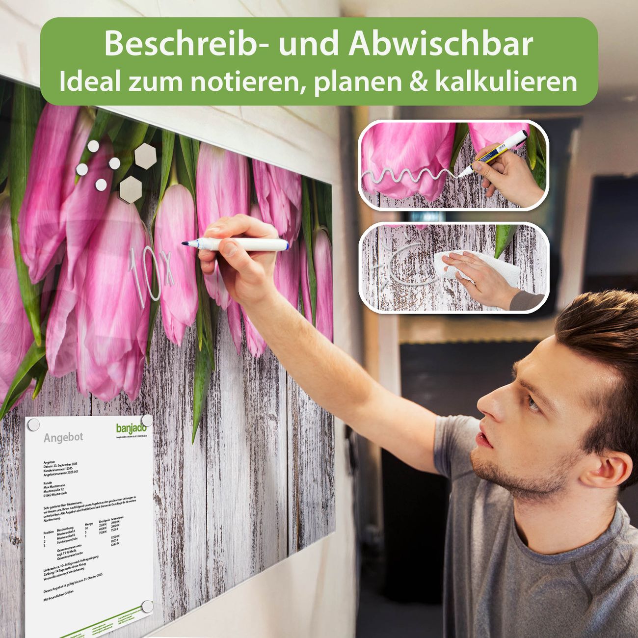 Die banjado Glas Magnettafel mit dem Motiv Motiv Holz und Tulpen verbindet Funktionalität mit Stil. Sie ersetzt das Zettelchaos durch klare Strukturen und bringt dabei eine warme, natürliche Atmosphäre in Ihr Zuhause. Ob im Büro, in der Küche oder im Eingangsbereich - dieses Design-Board zieht Blicke an und sorgt für Ordnung mit Charakter.